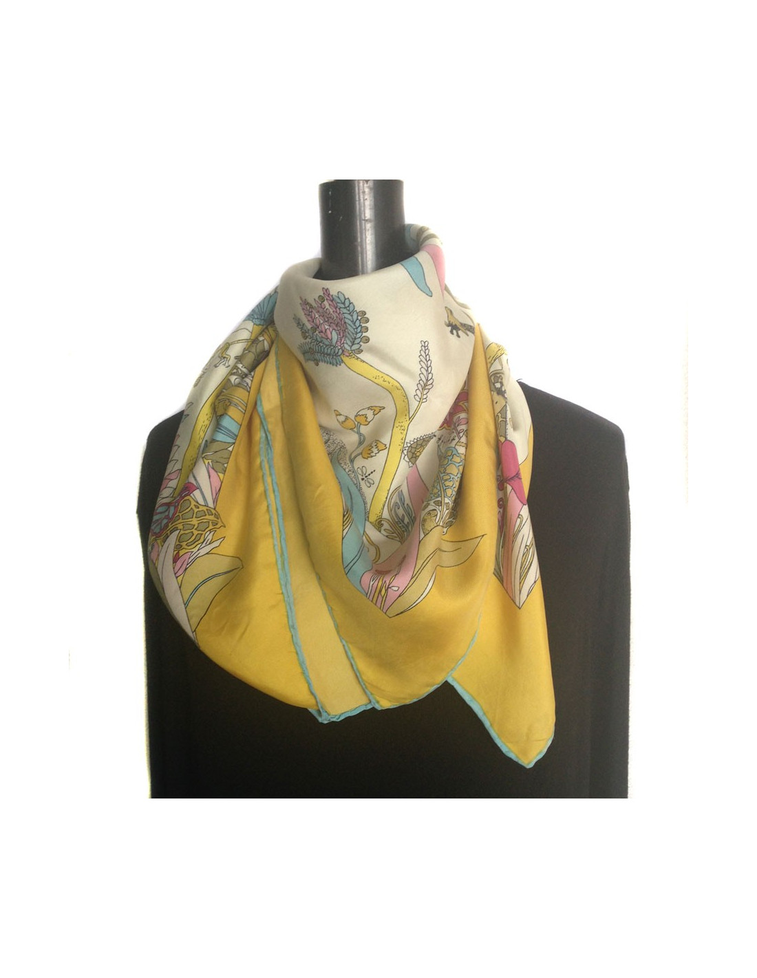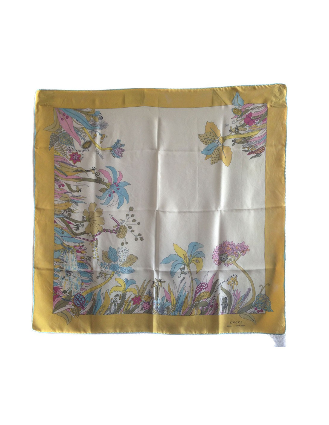 Square of silk GUCCI, vintage, in pastel shades of blue, yellow and purple. Reason: flowers of the Savannah. Signed GUCCI ROMA NEW YORK. Sign of fading on the yellow border (see photo). (Blue sky) trailer is in very good condition.