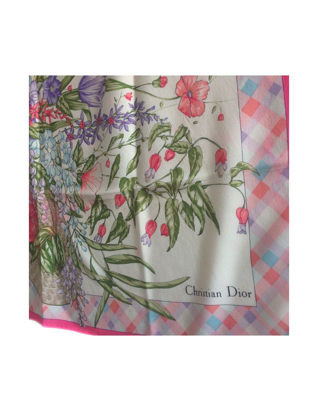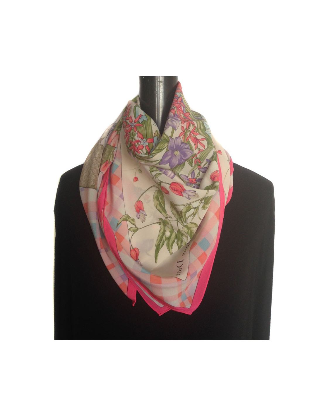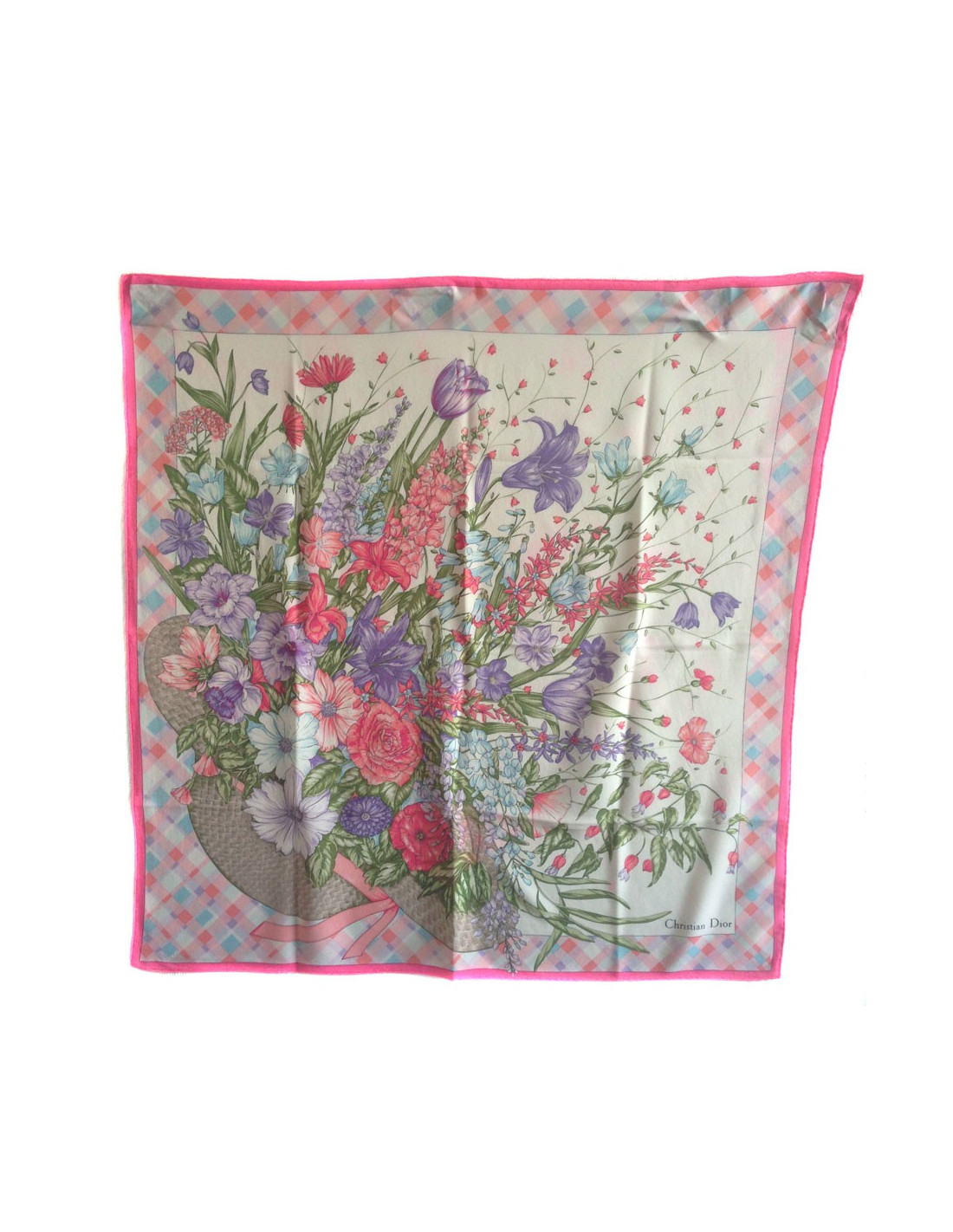 Beautiful square of chiffon CHRISTIAN DIOR in pink tones. In perfect condition. Vintage square. Reason: straw hat trimmed with flowers. Material label presents. The square has been cleaned to a luxury cleaners.