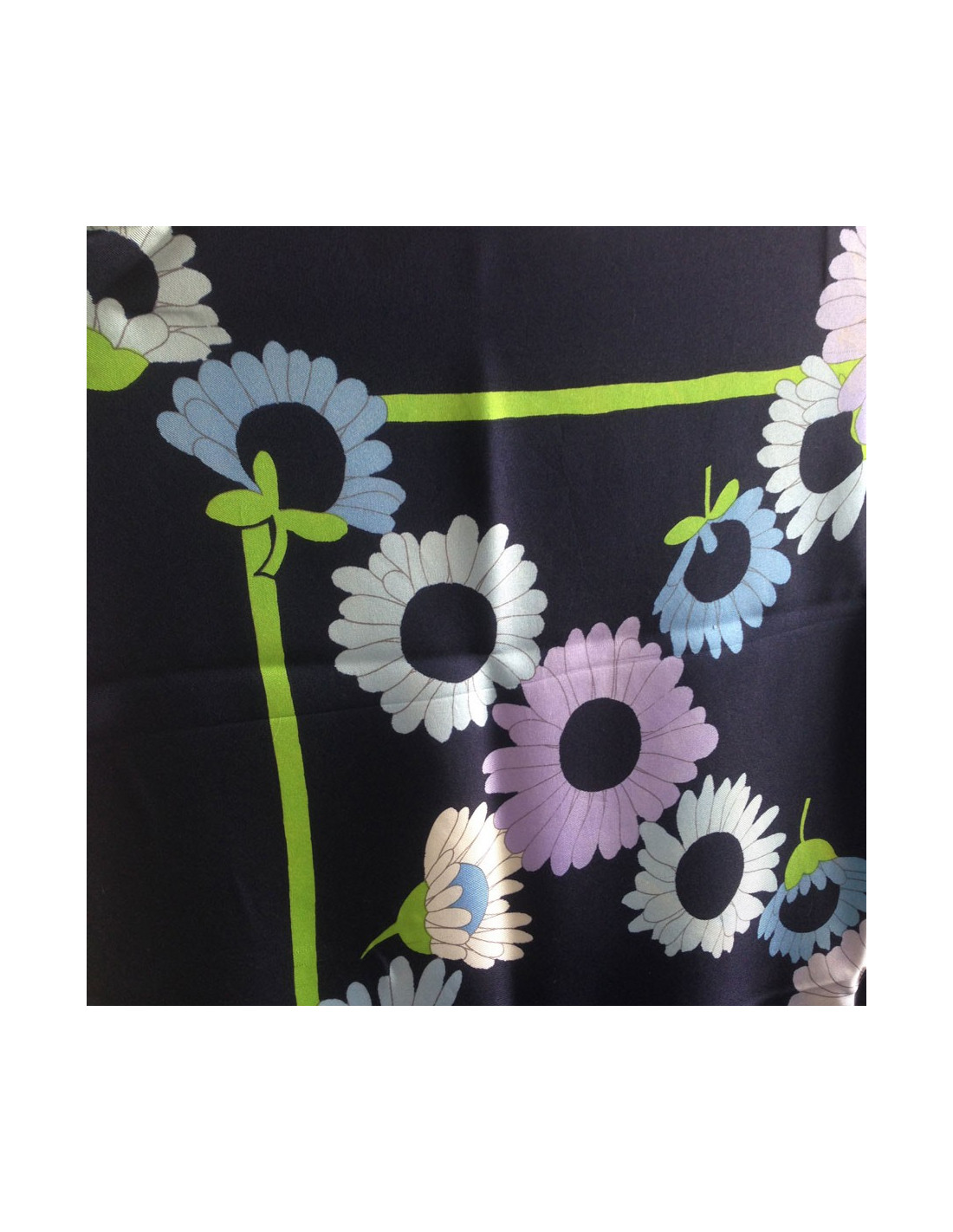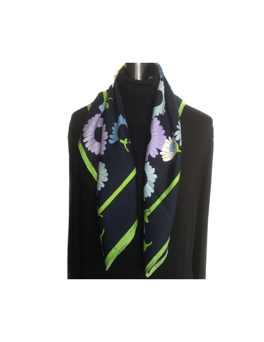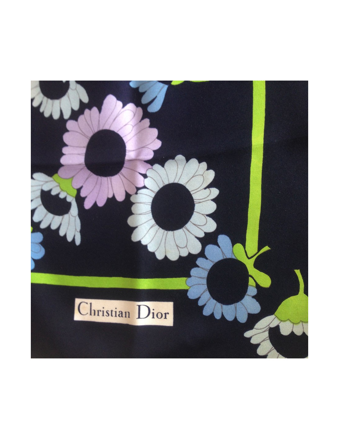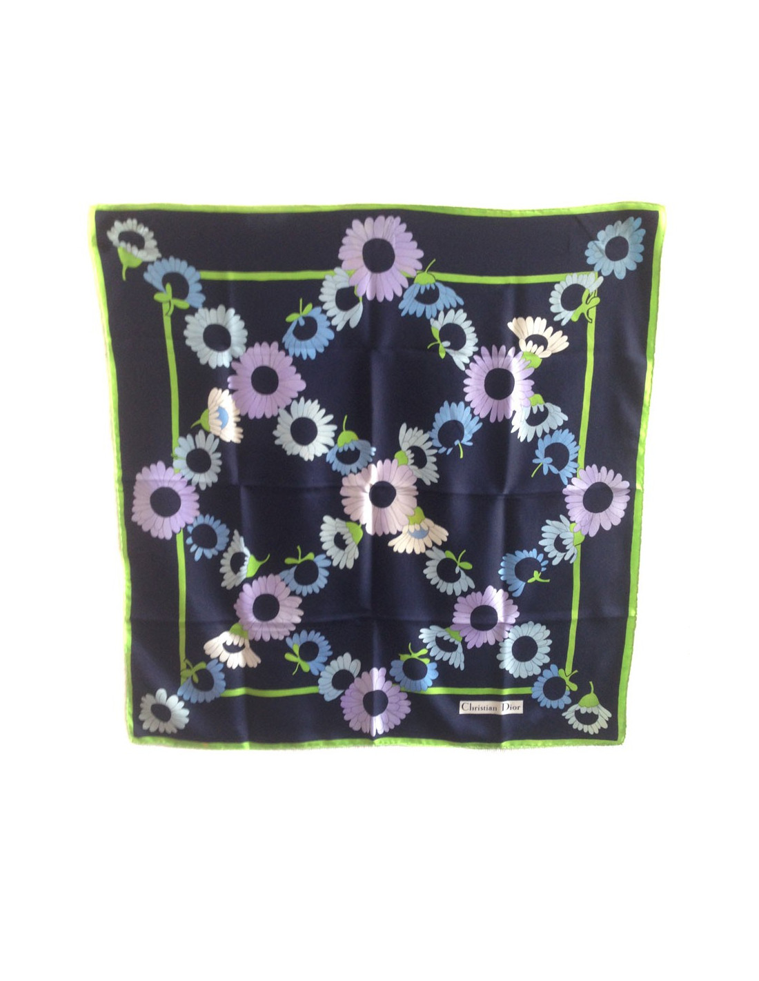 Très printanier!!!! Beau carré de soie Christian DIOR vintage, dans les tons bleu nuit, motifs : marguerites blanches, bleues pastel, mauves.