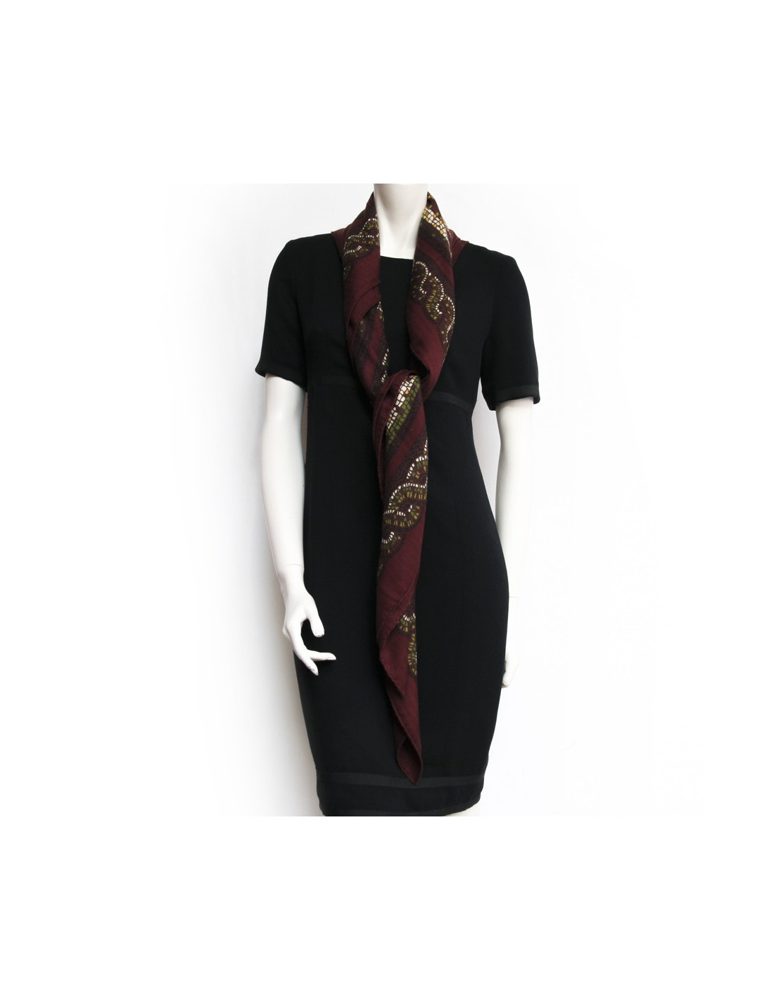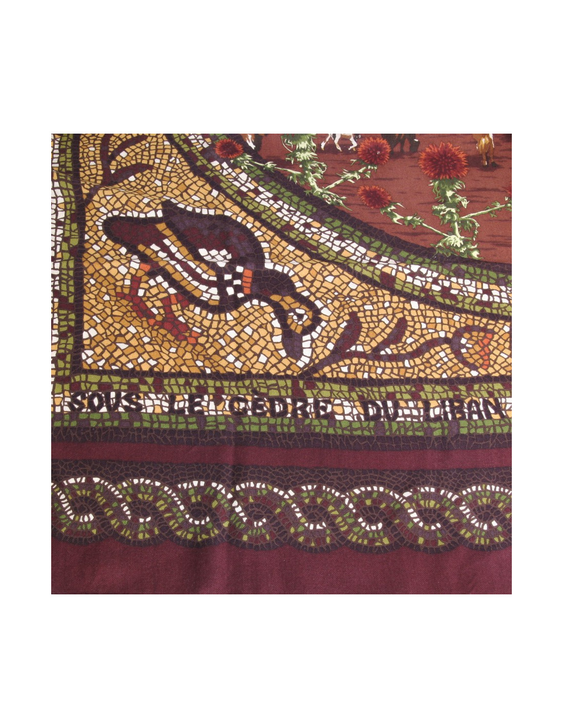 Hermès in cashmere and silk shawl "under the Lebanon Cedar", mosaic patterns with sumptuous warm colours, bright yellow green, Brown, bordeaux. Made in France. In very good condition.