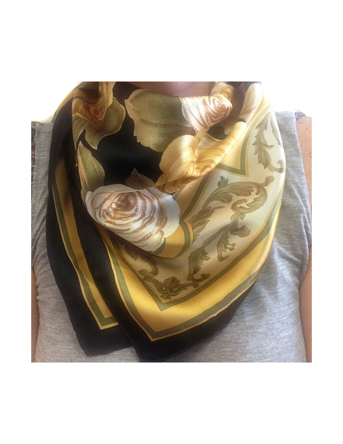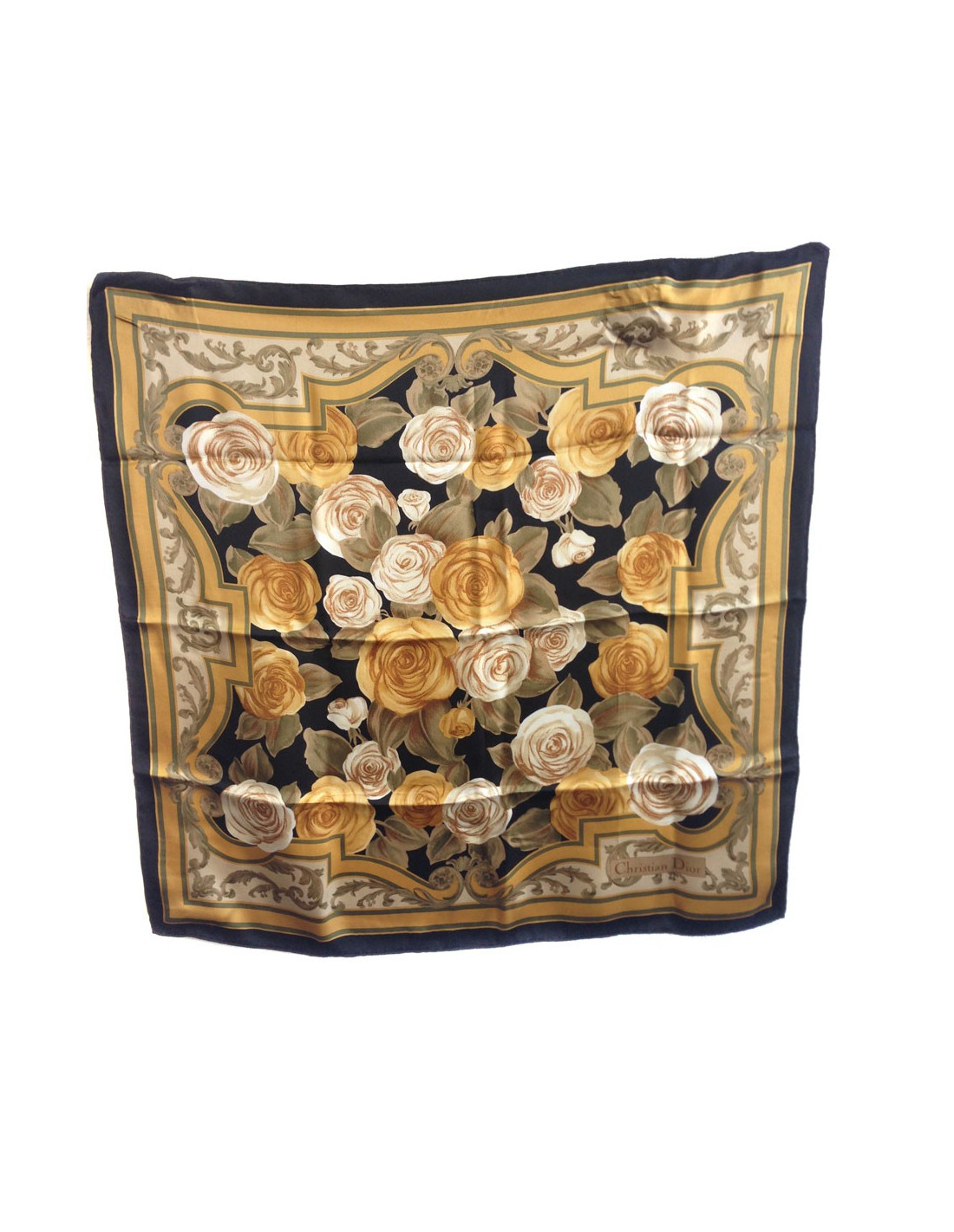 DIOR scarf in black and gold, silk flowers patterns. Black border and highlights fall (Brown, gold, black). The trailer is spotless. The scarf is in very good condition.