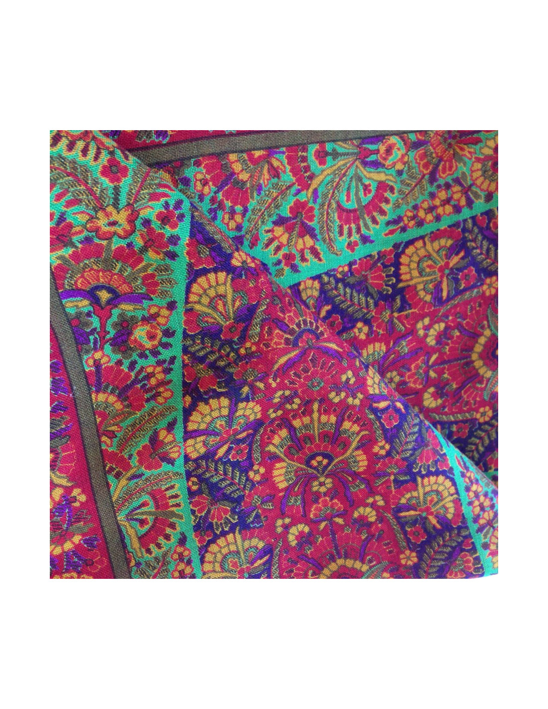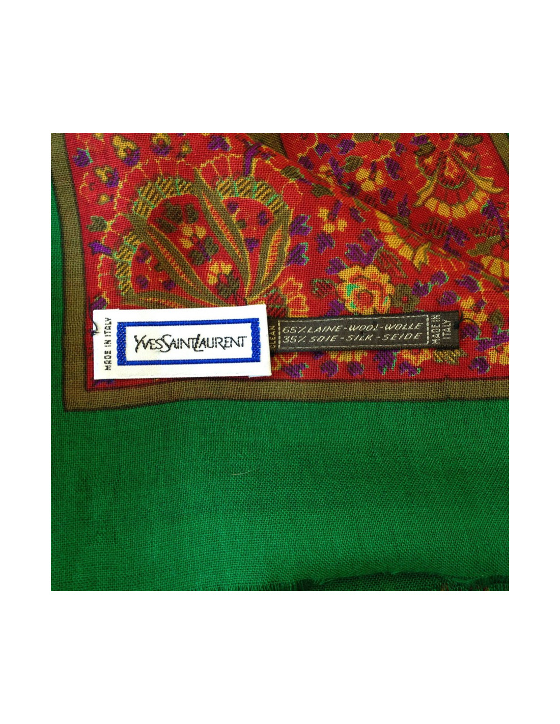 Great YVES SAINT LAURENT scarf in wool and silk. Colors: green border and background floral fall predominantly red. Fringed edge. Immaculate condition. Patch with the initials of the House printed on one edge of the scarf. Material label presents.