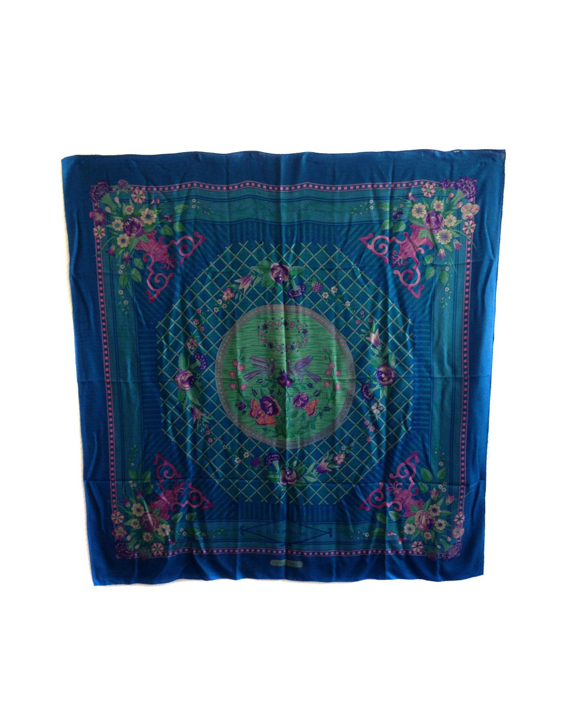 Shawl HERMES 'Game of straw' in cashmere and silk color blue duck. Floral patterns in shades of pink, green. A small light hooked on blue background (see photos). The trailer is a little defeated on a corner of the shawl (see photo). In good condition.