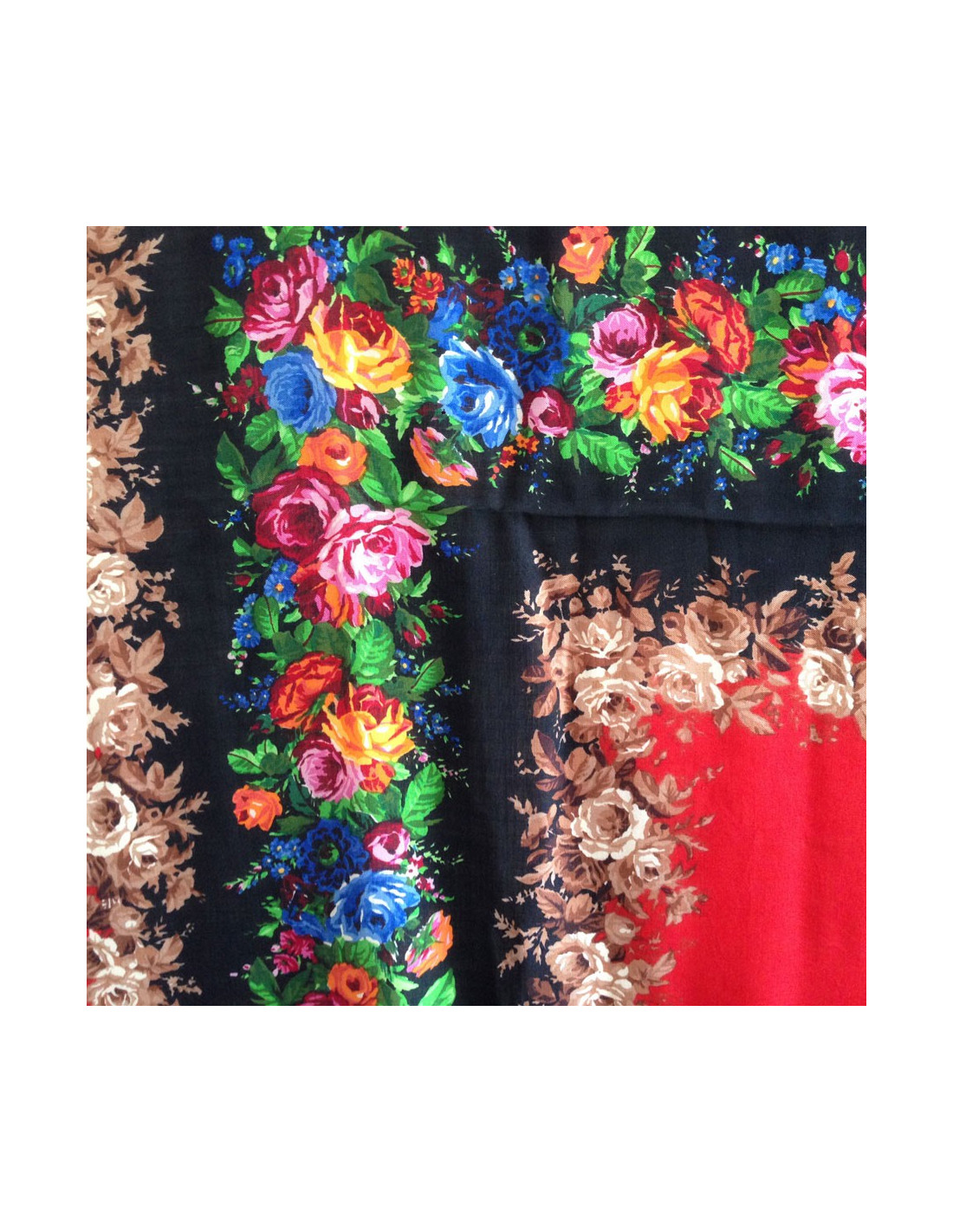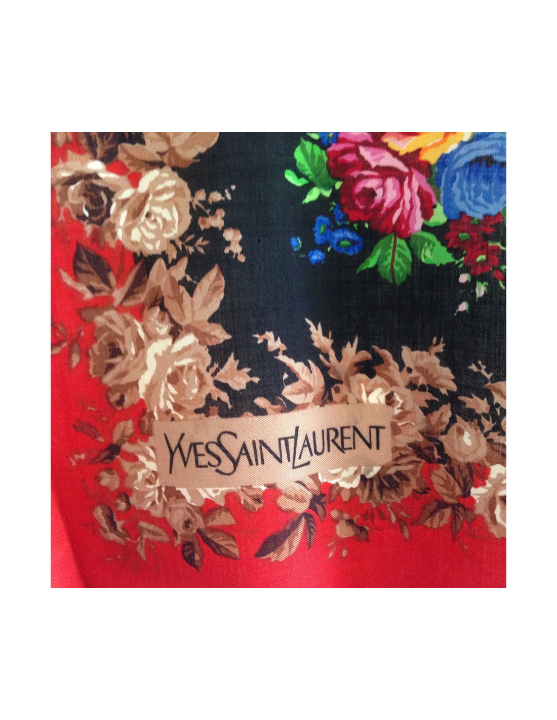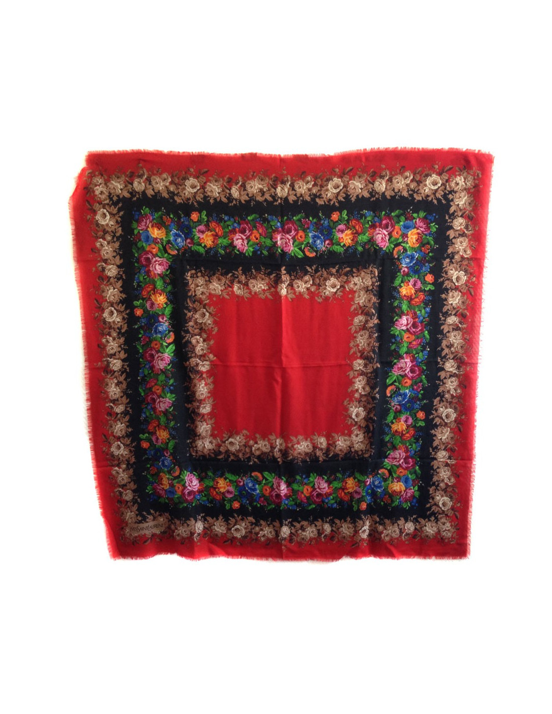 Details: Superb YVES SAINT LAURENT fringed shawl with red border and black background with a rose motif. The brand label has been cut out in one corner.