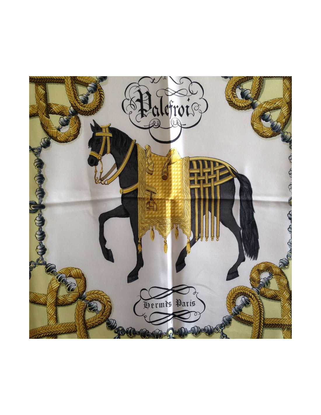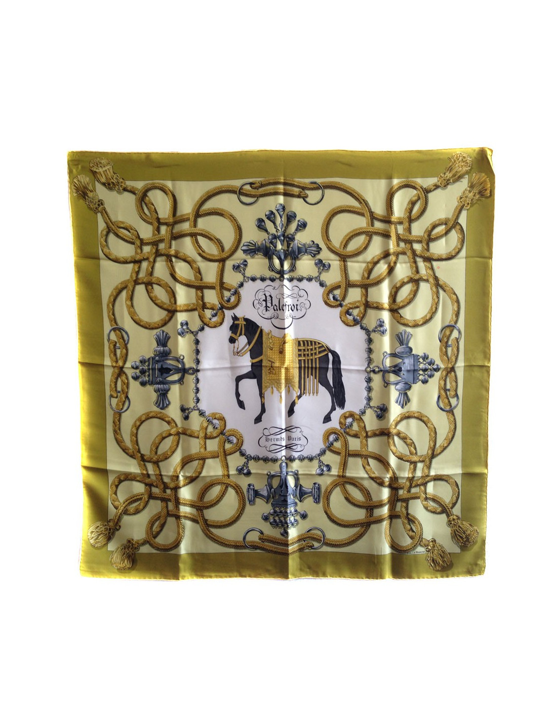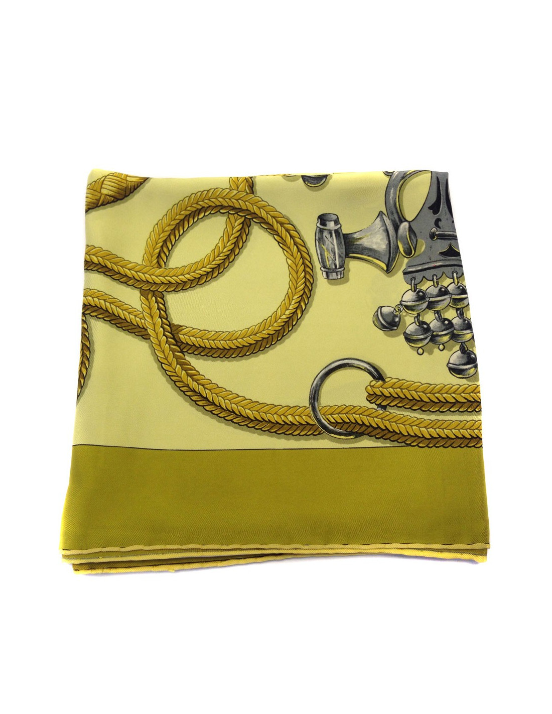 Last items in stock SCARVES AND SHAWLS HERMES "Folklore" white and yellow silk twill large scarf HERMES 17049 970.00 € HERMES "Folklore" white and yellow silk twill large scarf Made in FranceCondition: very goodMaterial: silkColors: yellow, white, blackDesigner: Henri d'Origny.S of the brand's salesMeasurements: 135x135xmDetails: HERMES “Folklore” giant square in feather silk twill with yellow borders on a white background. Impeccable black rolled hem. Advantage Valois... Add to cart