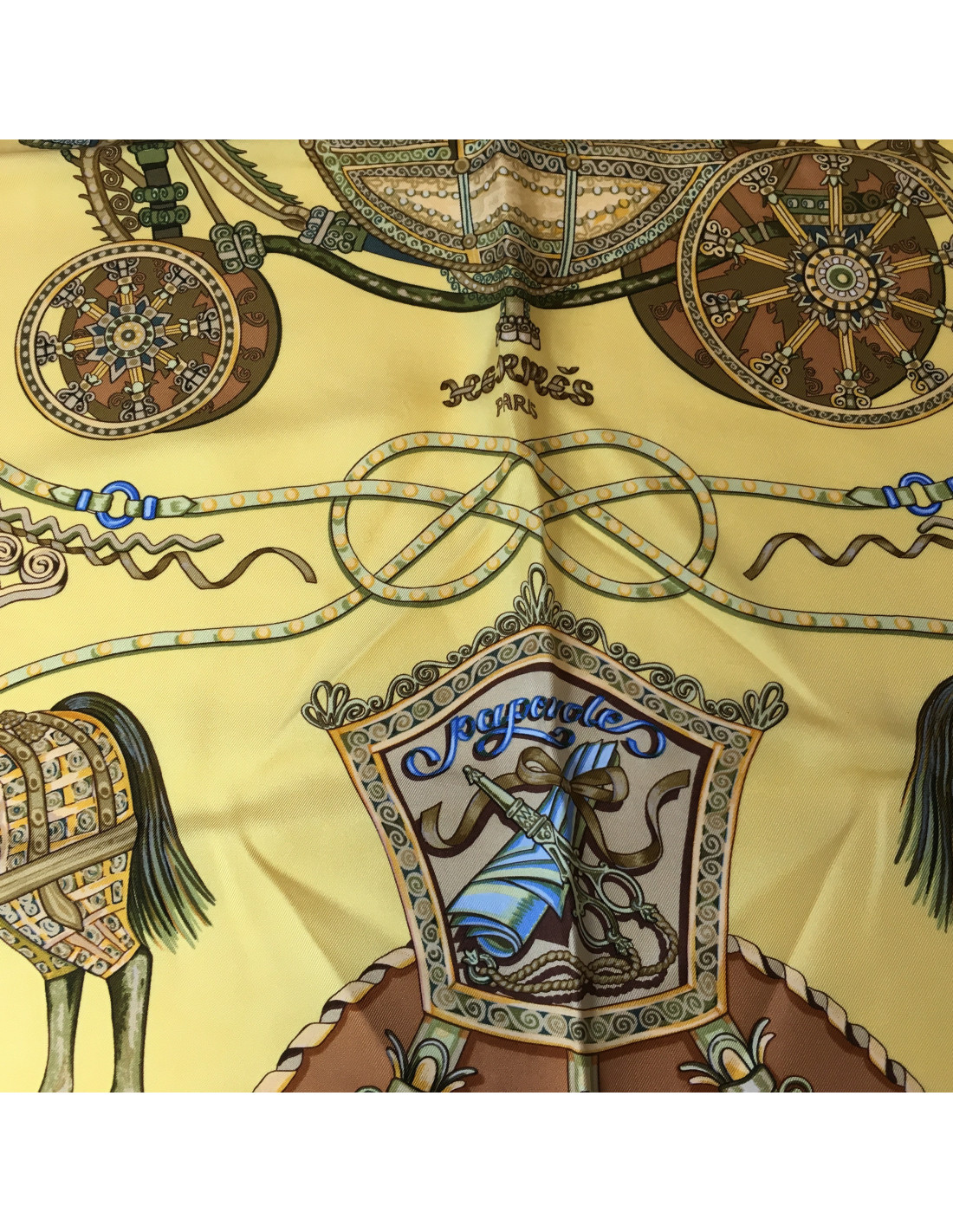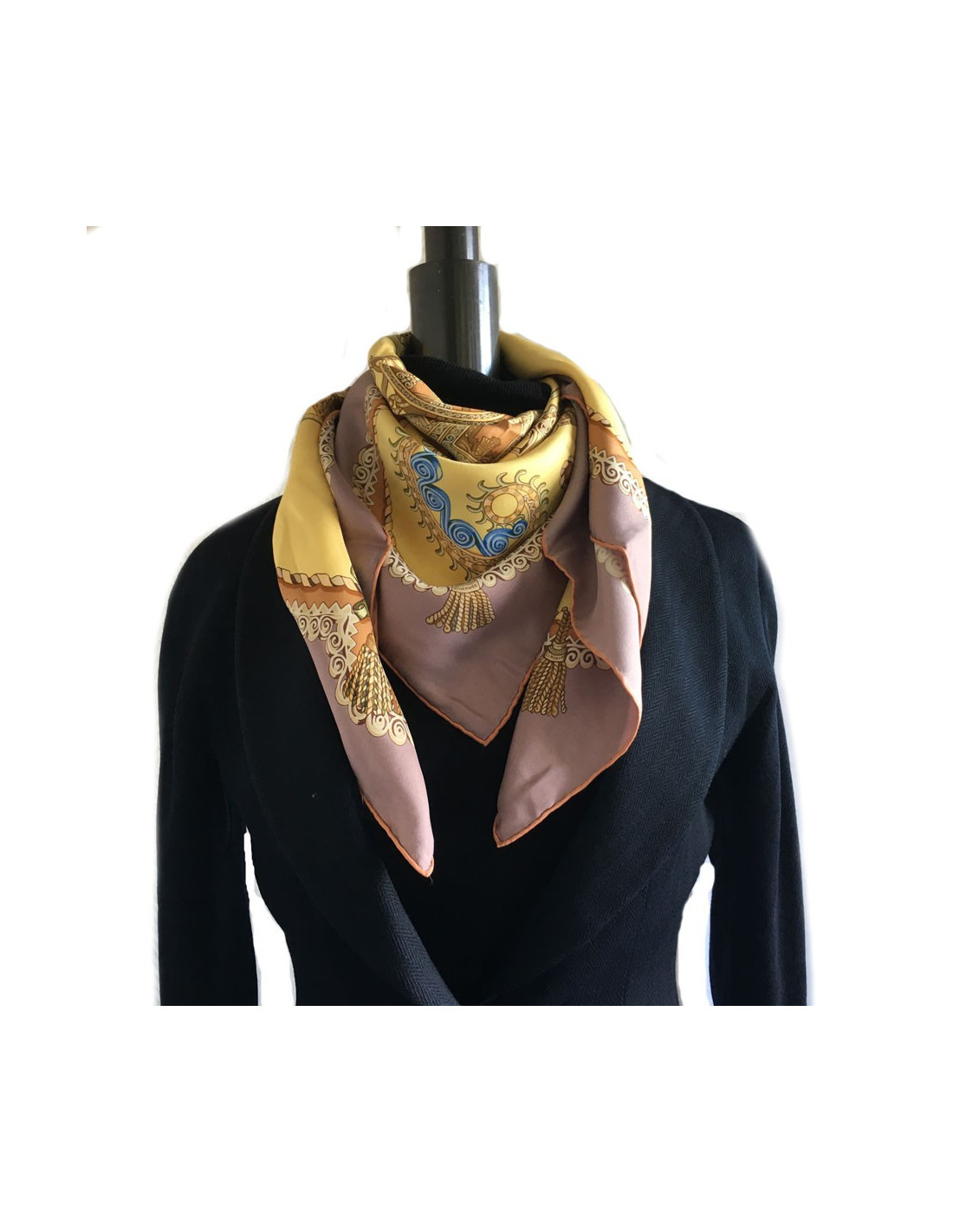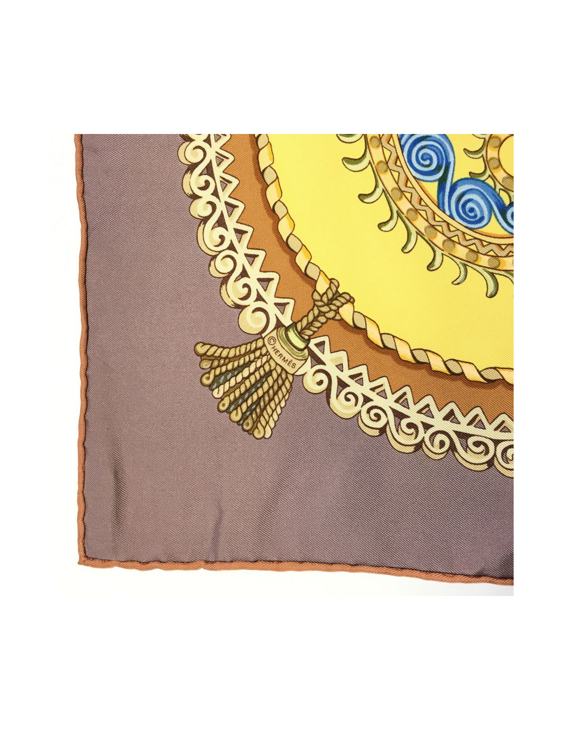 Square silk HERMES "Papéroles". At bottom yellow square, multicolored patterns and purple border.