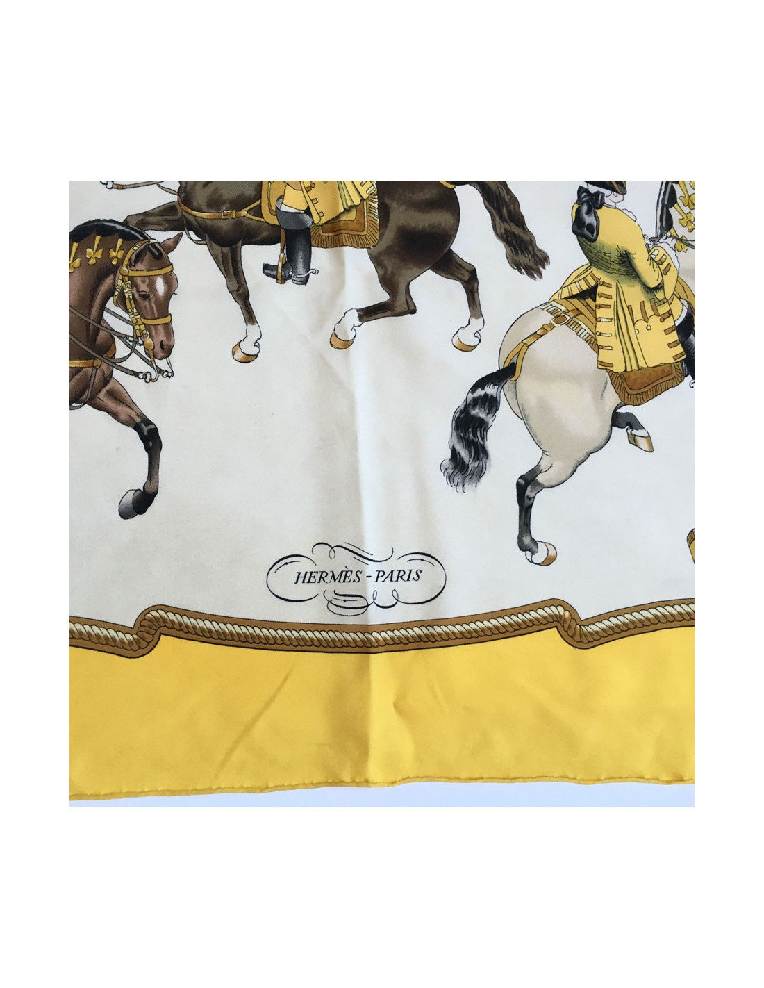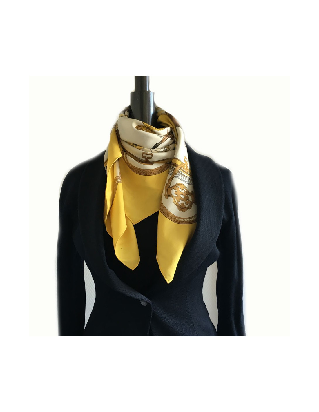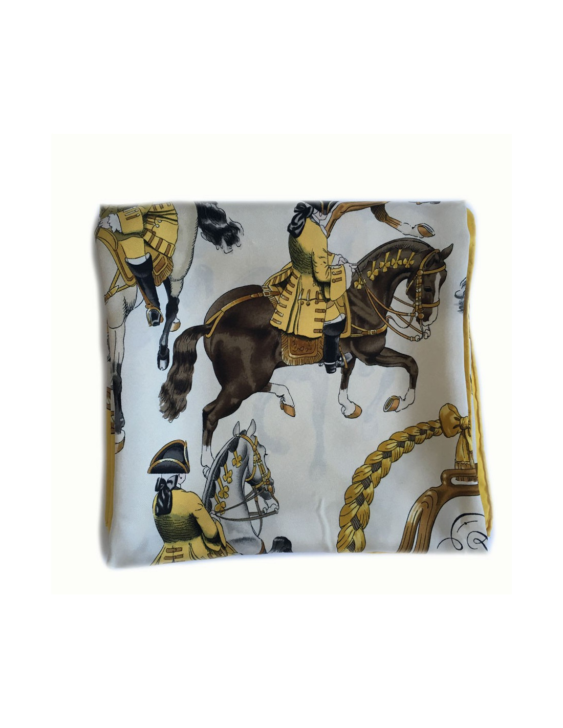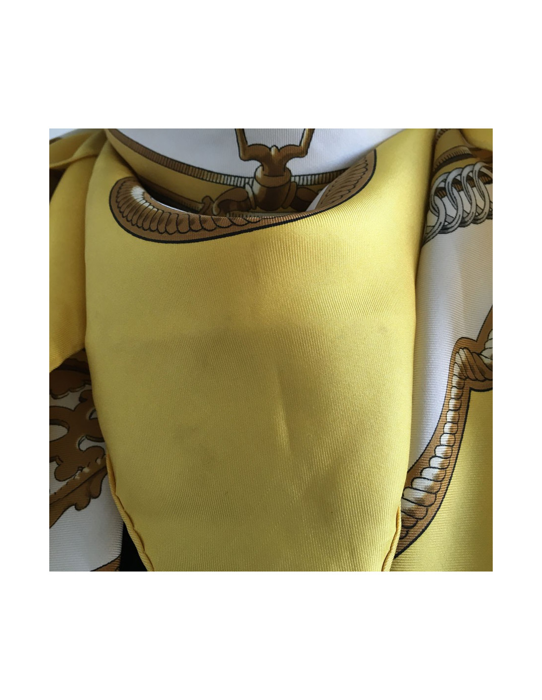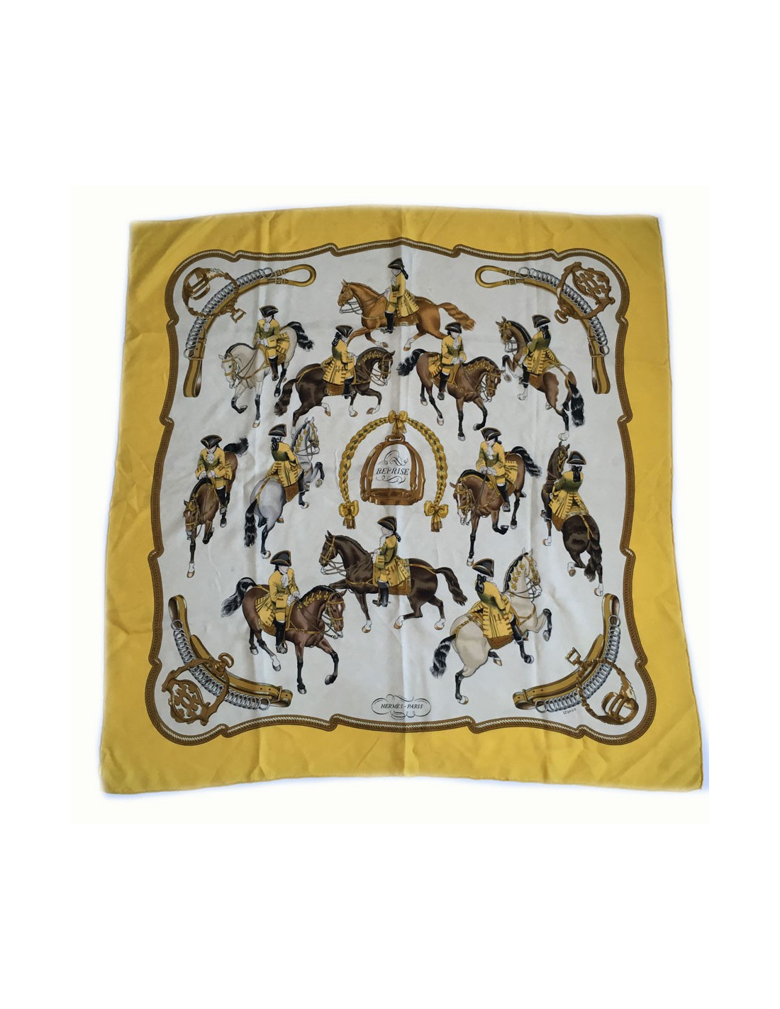 Hermès "Recovery" in yellow silk. Yellow border and off-white background.