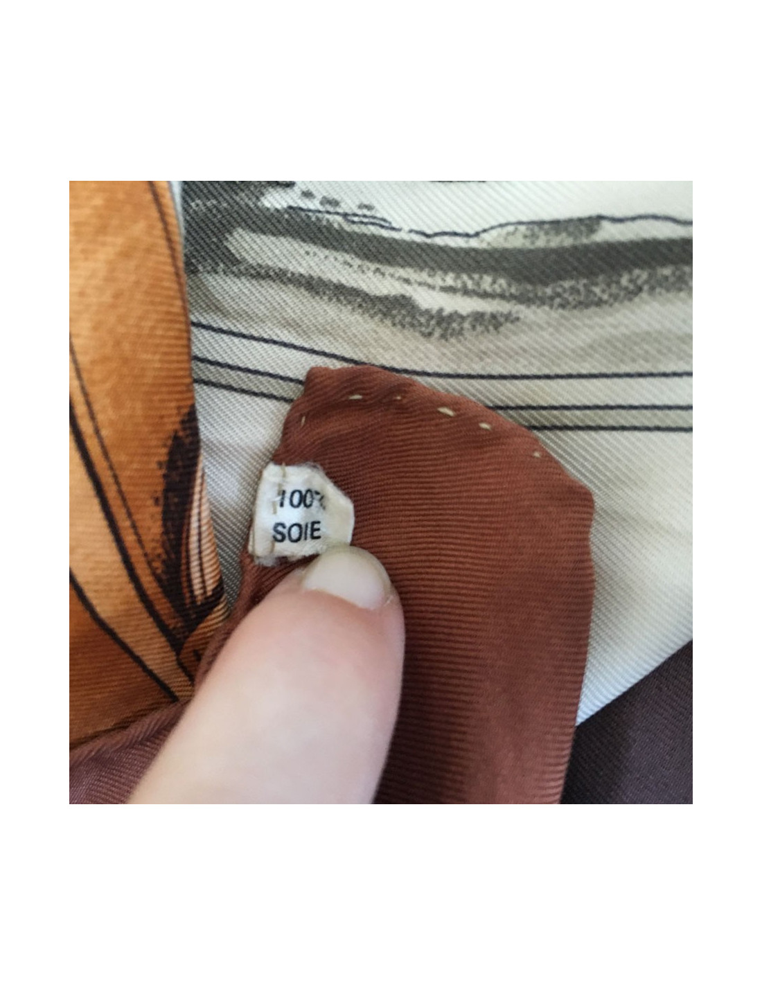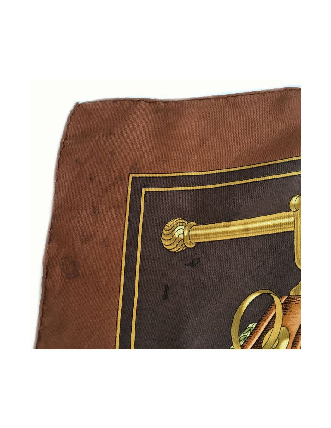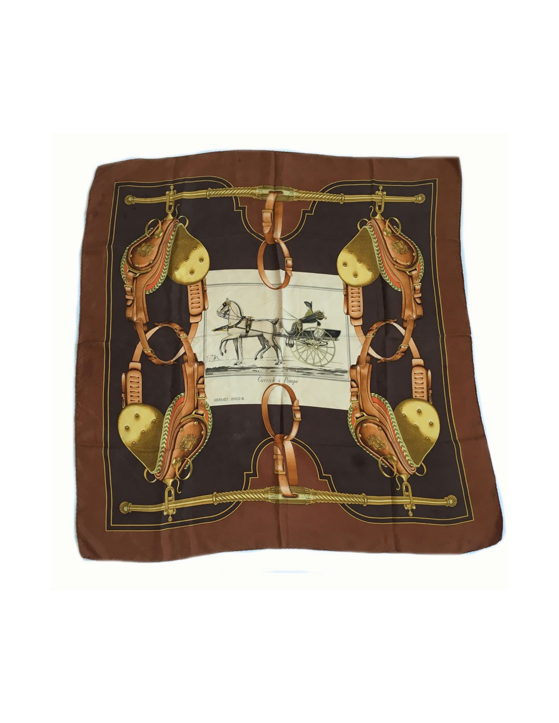 Square HERMES "Carrick to pump" Brown silk. Vintage piece. Designed by LEDOUX. Clear Brown edge, chocolate and beige background. The trailer is in good condition. Small recovery sewing in a corner of the scarf (see photo). A few spots on the square.