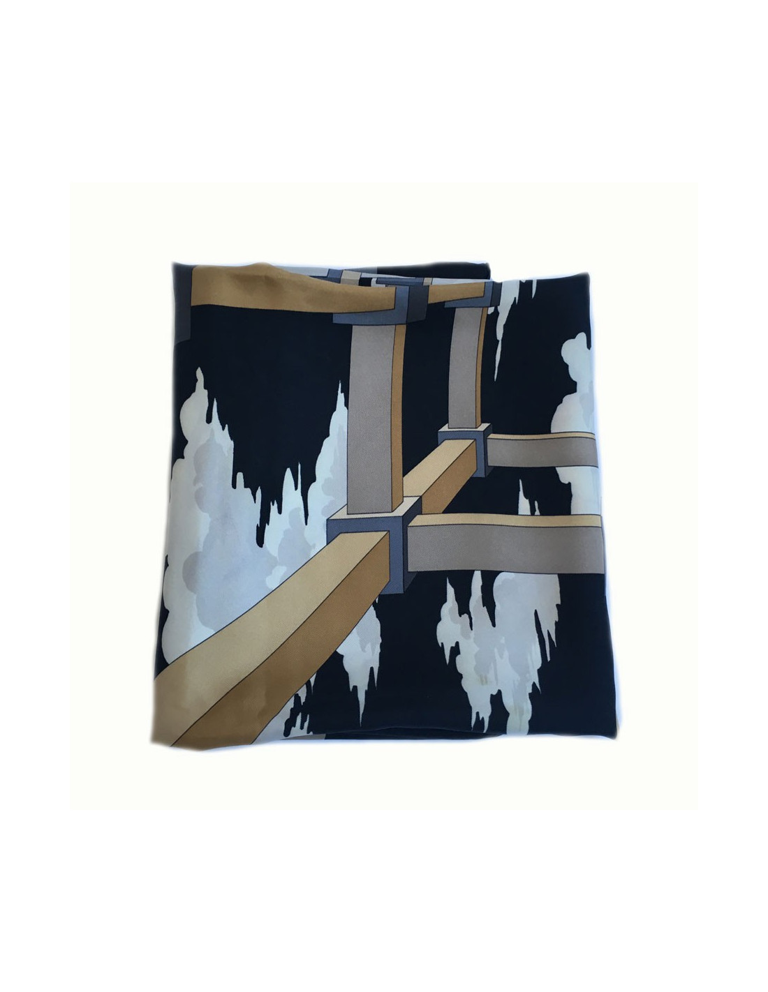 Hermès "A.M. CASSANDRE for HERMES" in silk. Black border, beige, gray, brick background. Vintage square. Absence of label material. The trailer is spotless. Minor stains and discolorations on the light background.