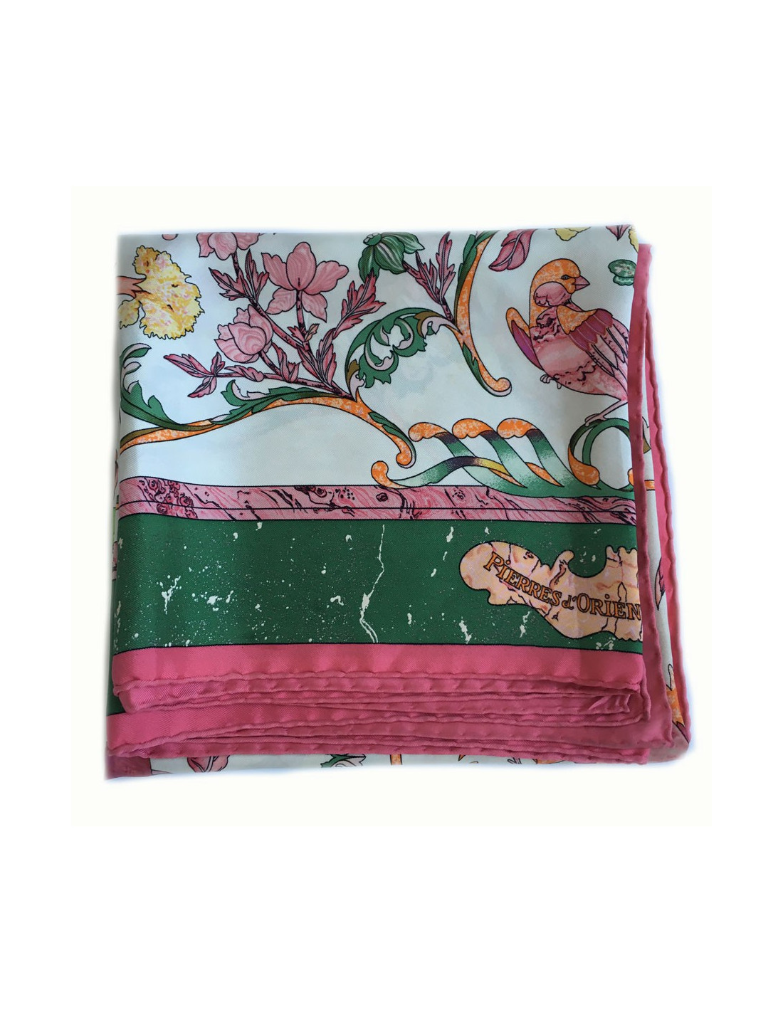 Hermès scarf 'Pierres d'Orient et d' Occident" in silk. Silver and white spotted effect on the green edge. Pink border, green, off-white and pink background.