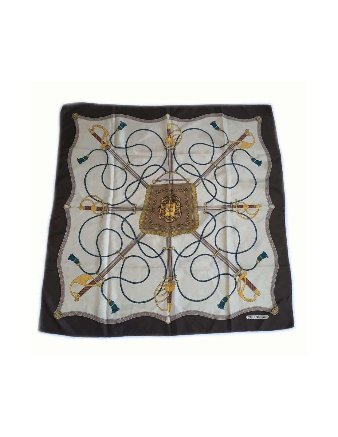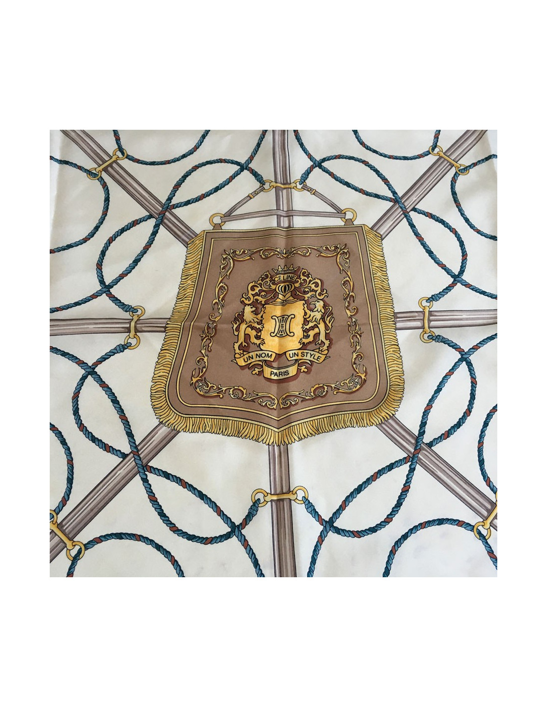 "A name, a style" CELINE scarf silk. Chocolate border, ecru background with multicolored patterns. A few spots on the headscarf (see photos). The trailer is spotless. In one condition.
