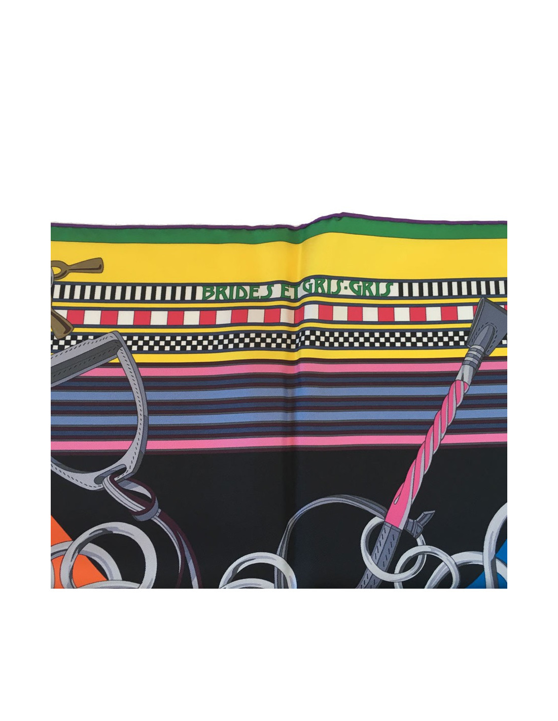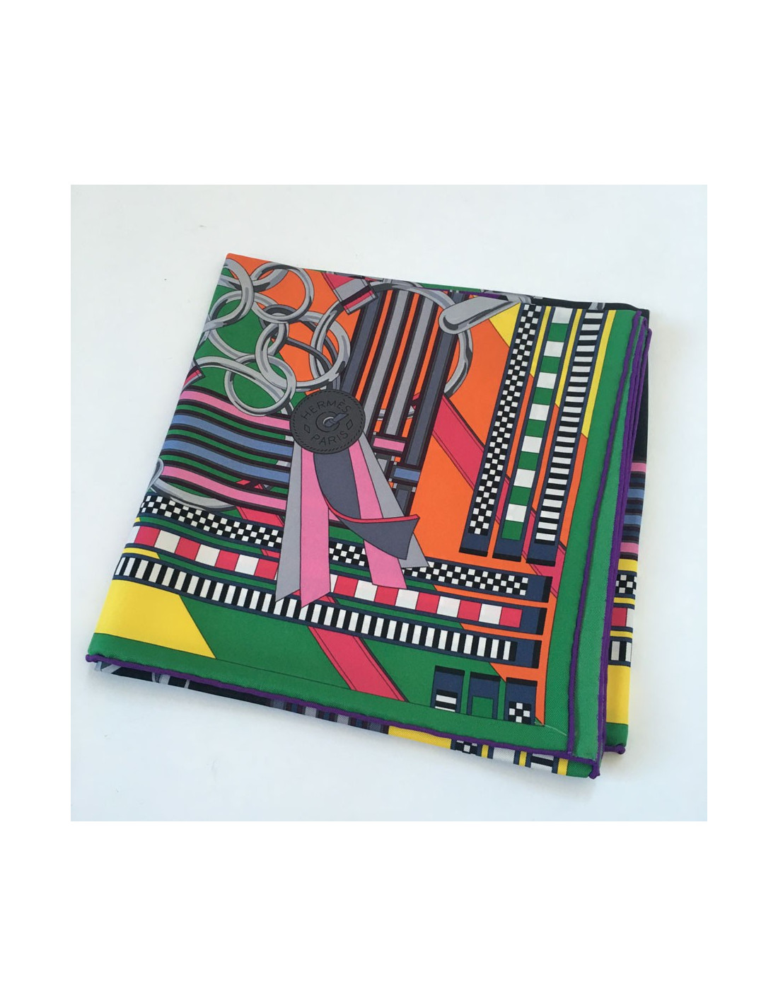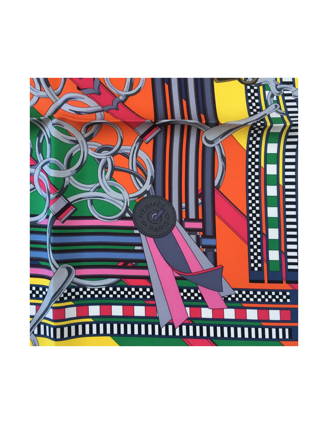Square HERMES ""Flanges and gris-gris"in black, orange and bright yellow silk"
