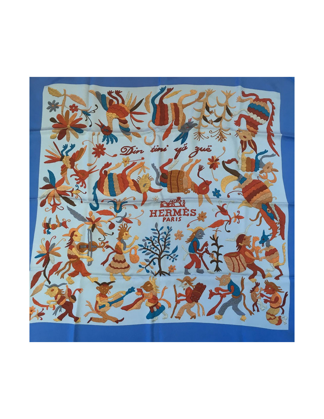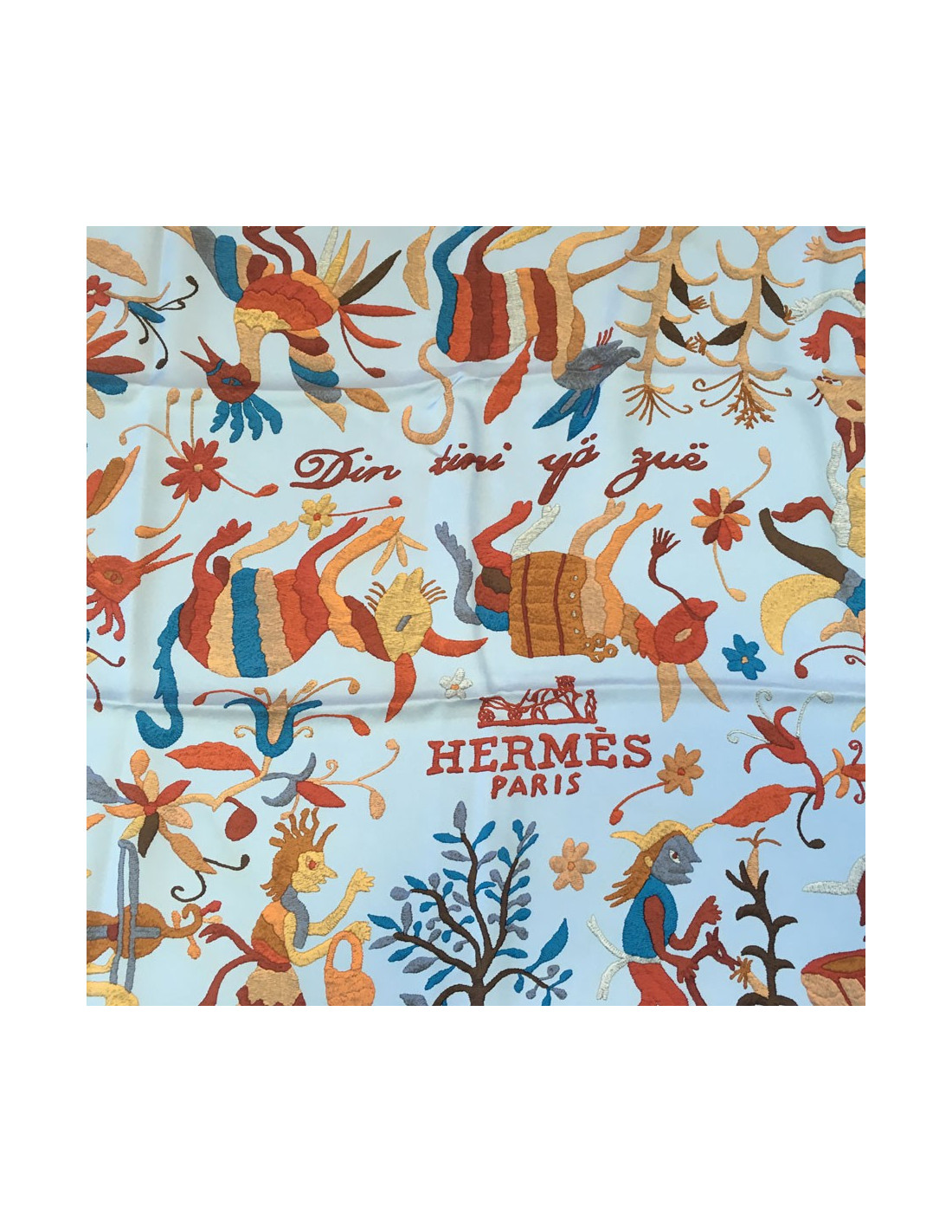 HERMES “Din Tini Ya Zue” scarf in blue silk, multicolored background.