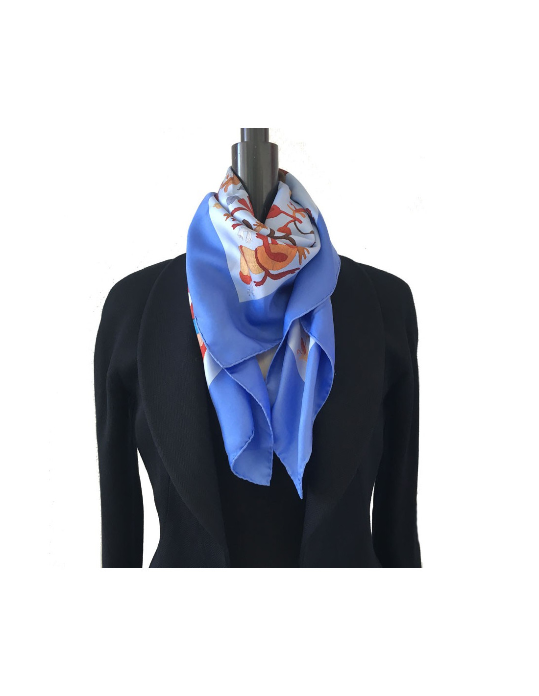 HERMES "Din tini ya sue" blue silk square scarf