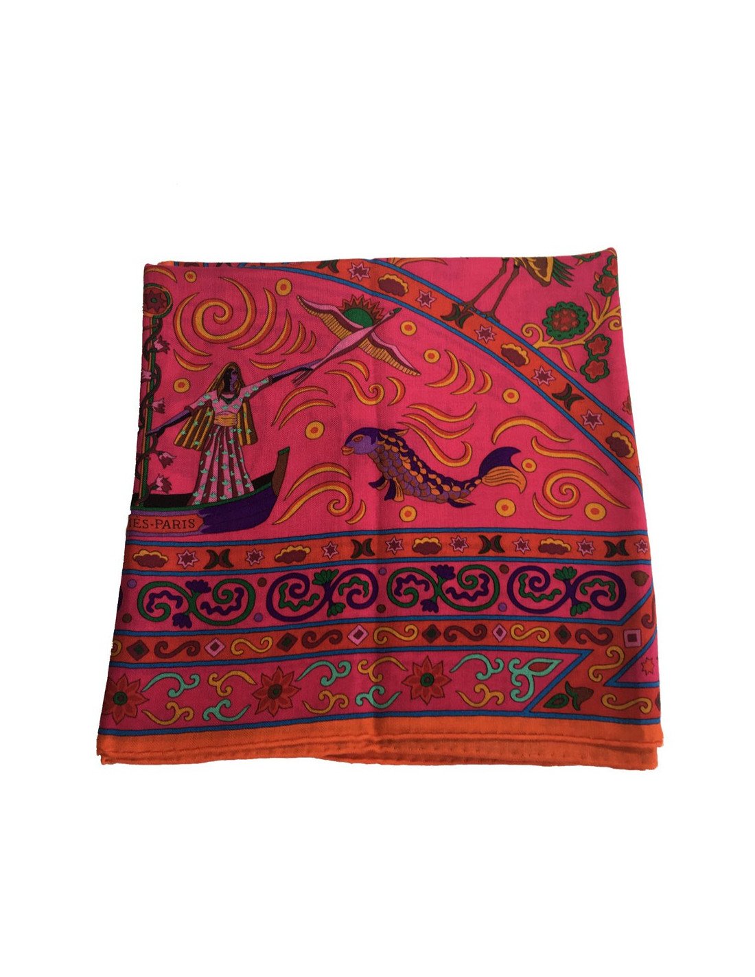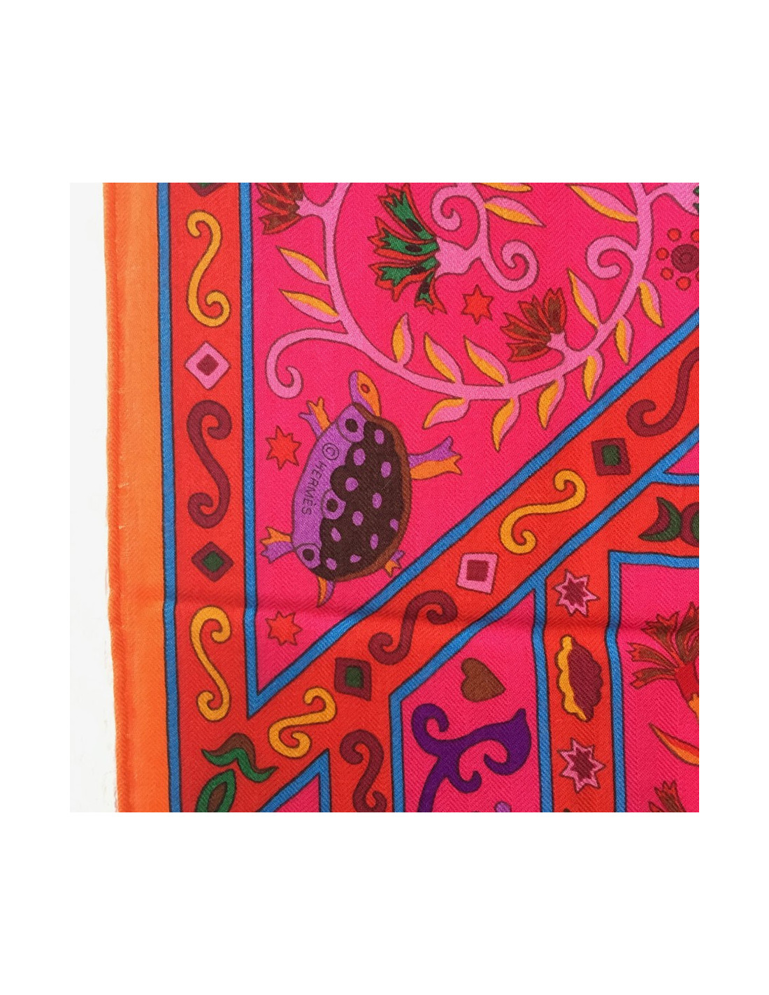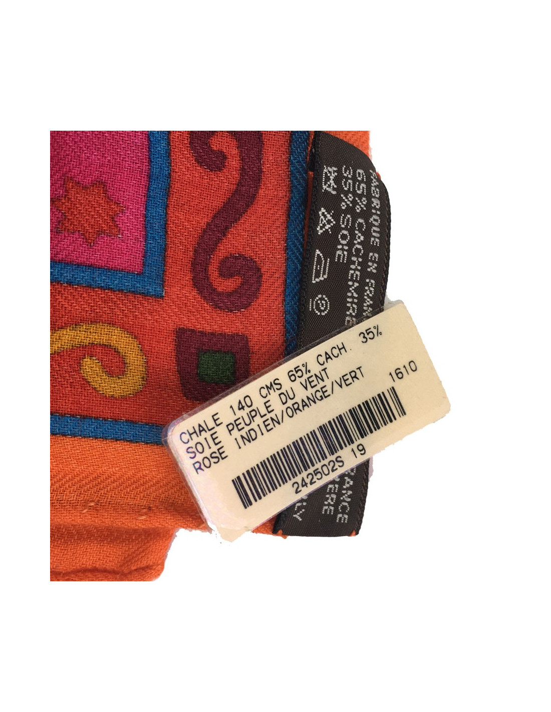 HERMÈS shawl 'Peuple du vent' in and orange, Indian pink, green cashmere and silk fabric.