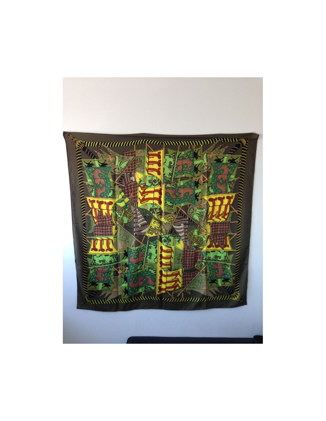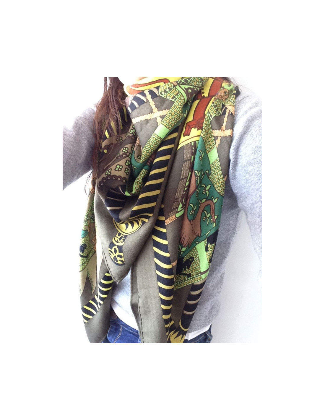 Beautiful shawl Hermes in cashmere and silk, in shades of green, Brown, on the theme of the Savannah, signed Annie Favre.