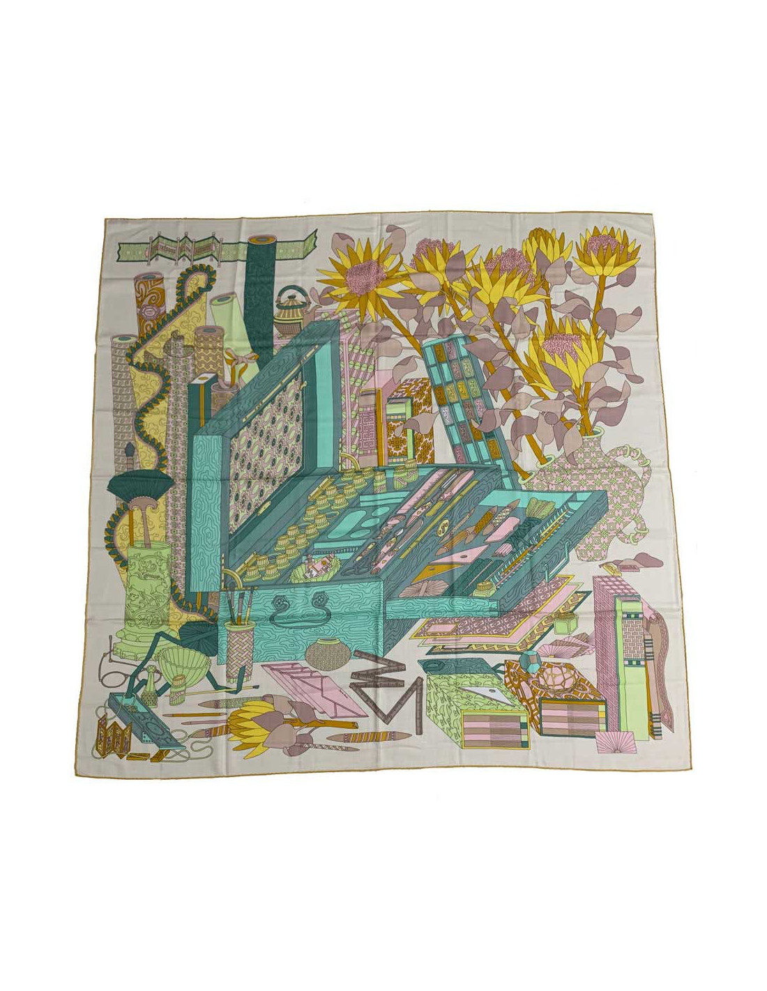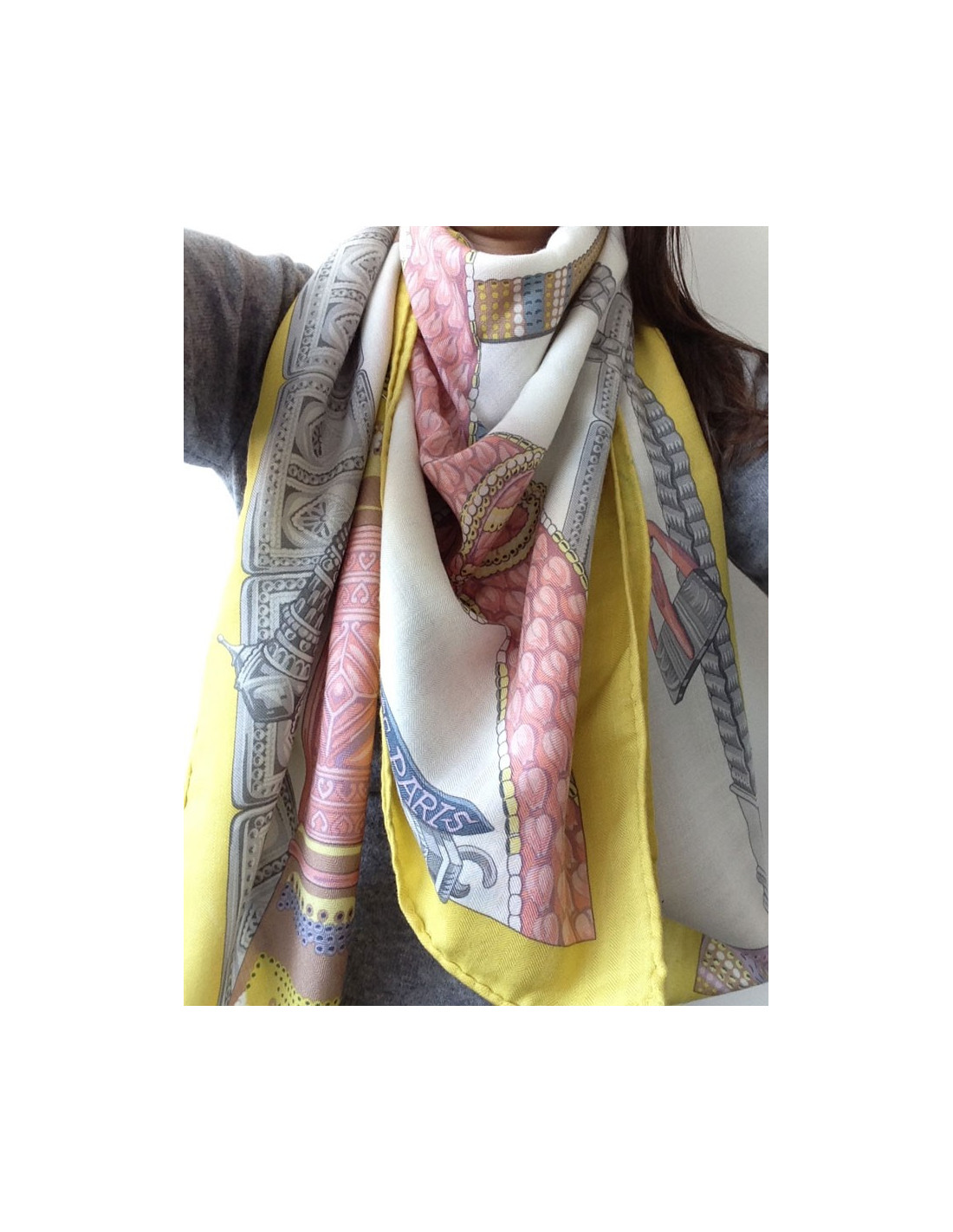 Large shawl 'Belts and links' Hermès in cashmere and silk in the colours white, pink, yellow, signed Toutsy.