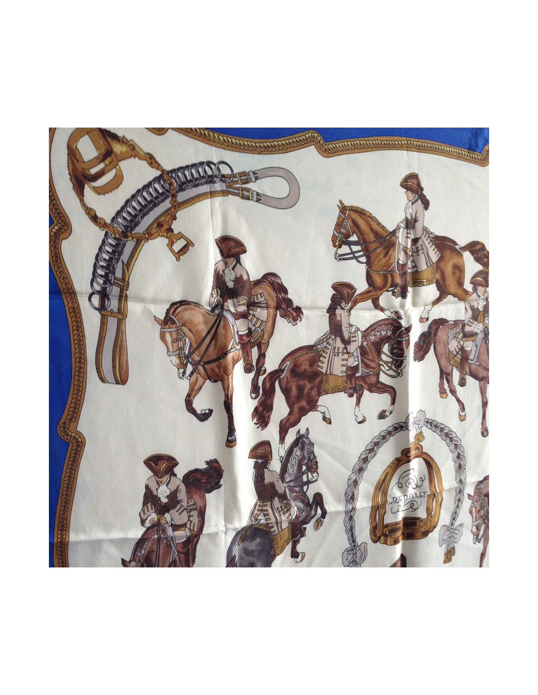 Square, Hermes, 100% silk, model "Revival", signed "Ledoux". Blue frieze, off-white background. Vintage scarf. Light blue discoloration on the bottom. Used condition.
