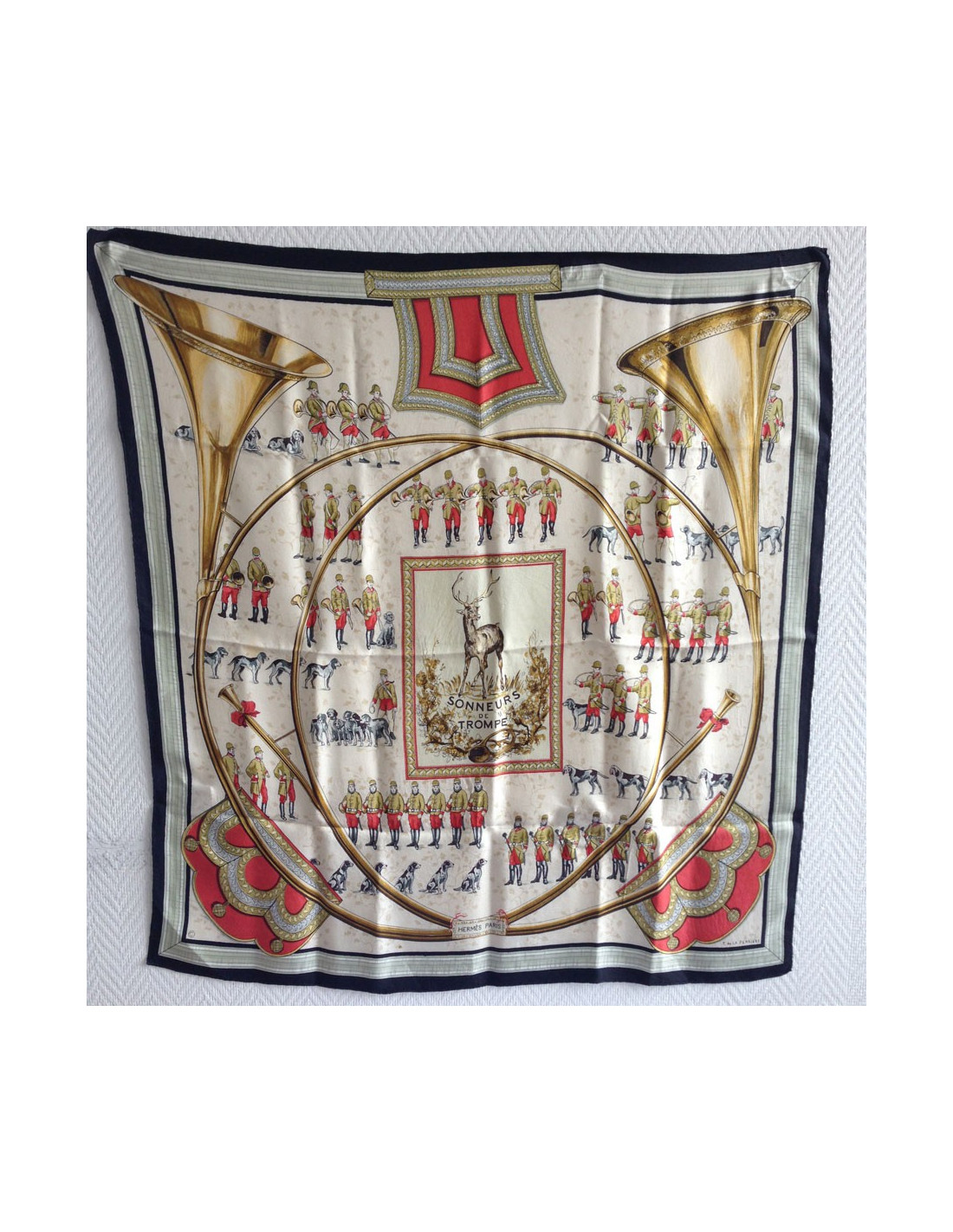HERMES scarf in 100% silk, vintage, 'Sonneurs de Trompe', signeous "F. De La Perriere"frieze green soft and white, off-white background. The central motif is a deer. The trailer is still nice round, slightly defeated on the left side of the scarf, some inconspicuous spots. Slightly tapered to two places. In good general condition.