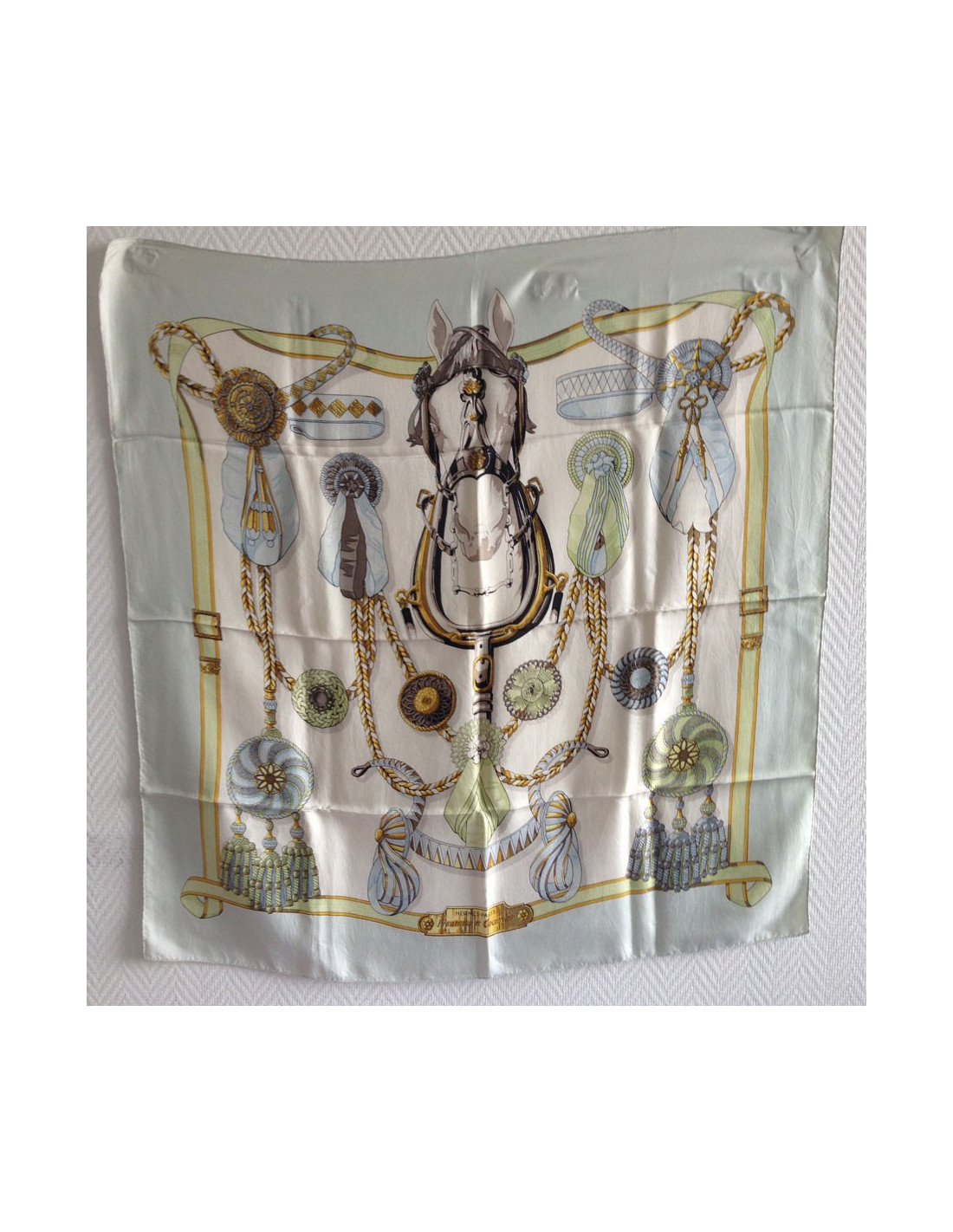 Carré Hermès, 100% silk, model "Front-end and Cockade". Slight stains. Square vintage, green frieze of water on a white background, discrete tasks to use.