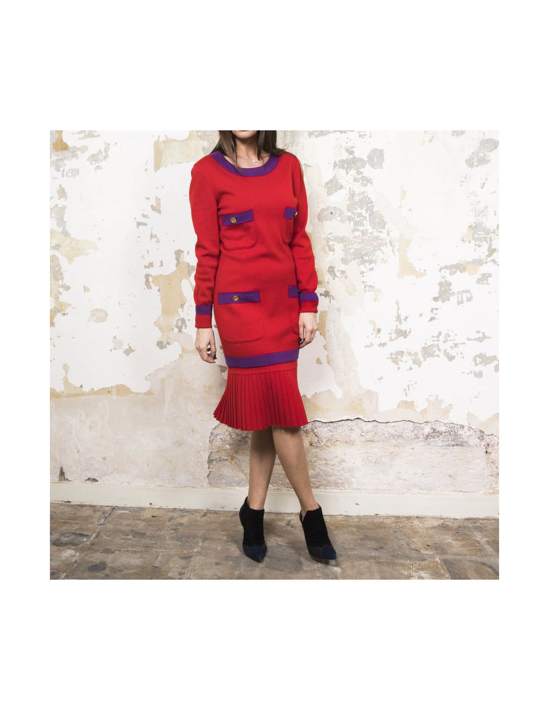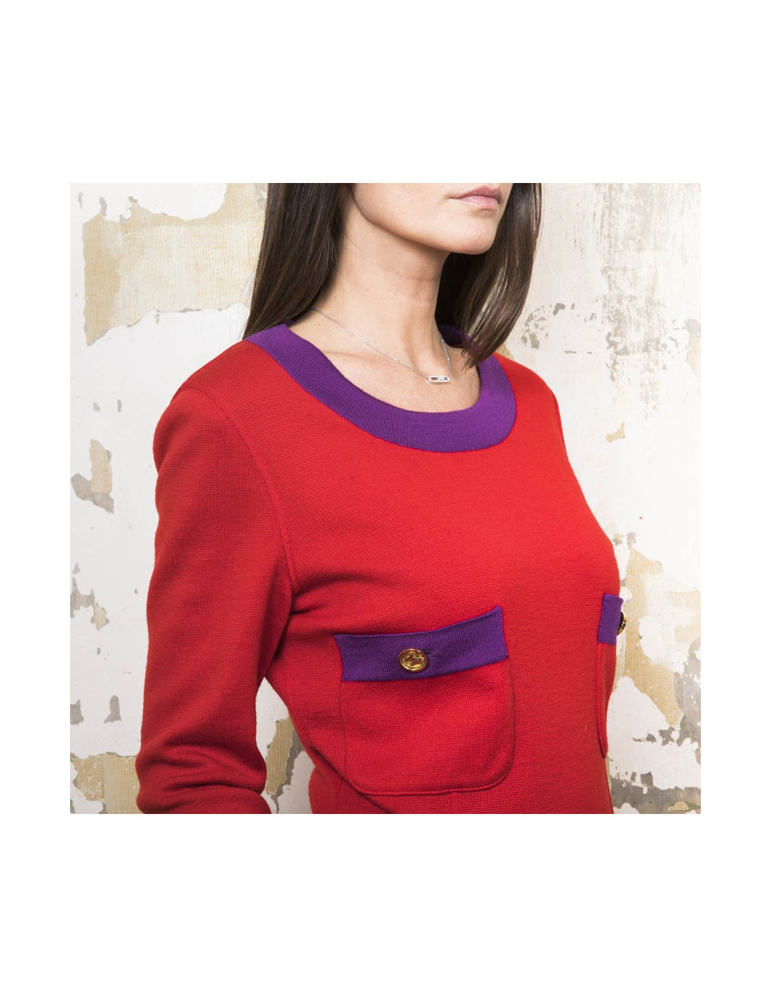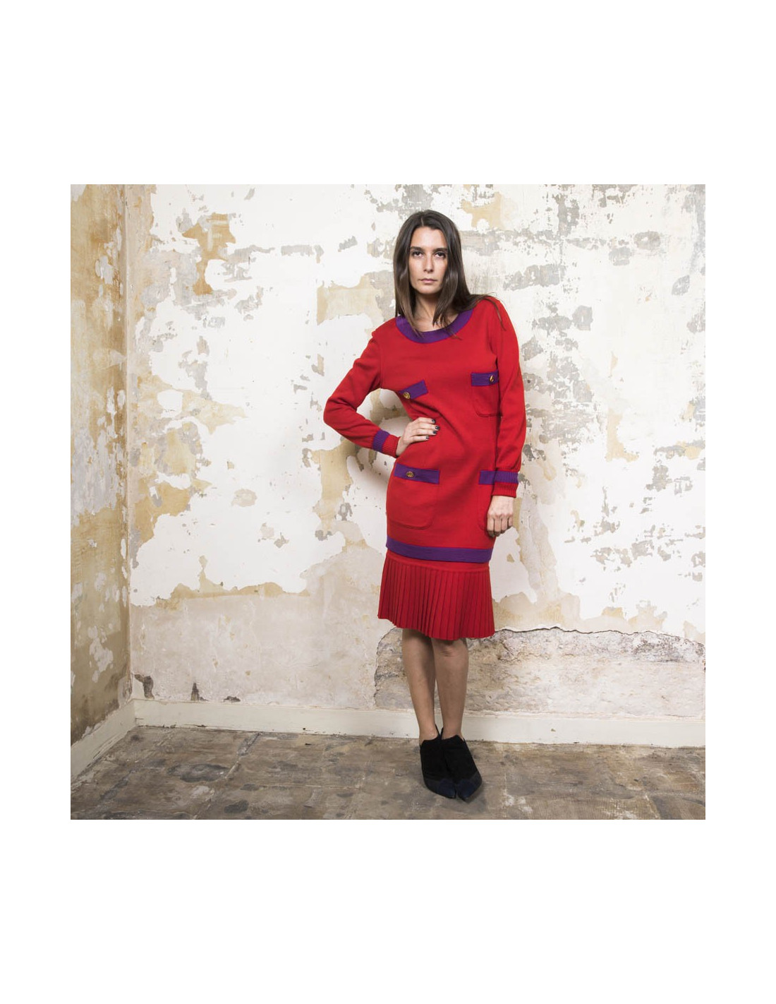 Chanel vintage sweater and skirt set in red wool with purple borders. Made in Italy. Vintage.