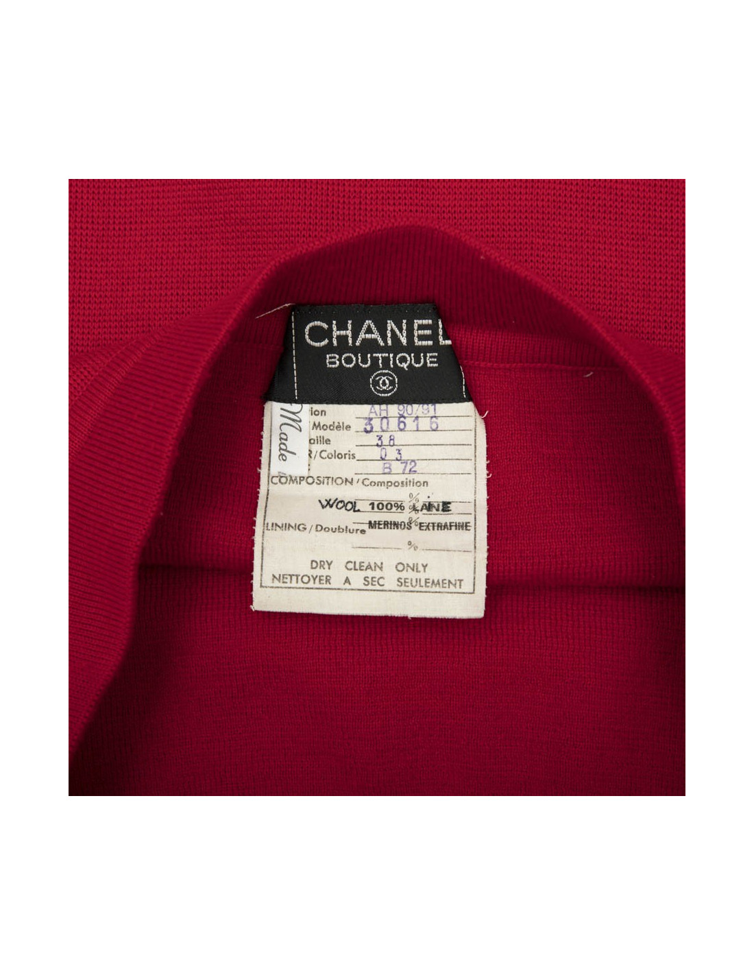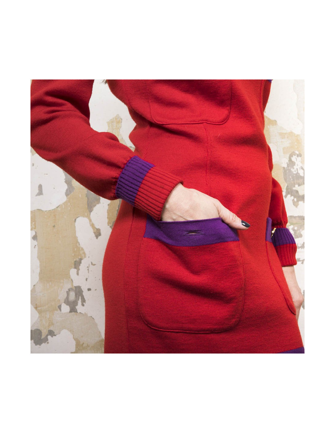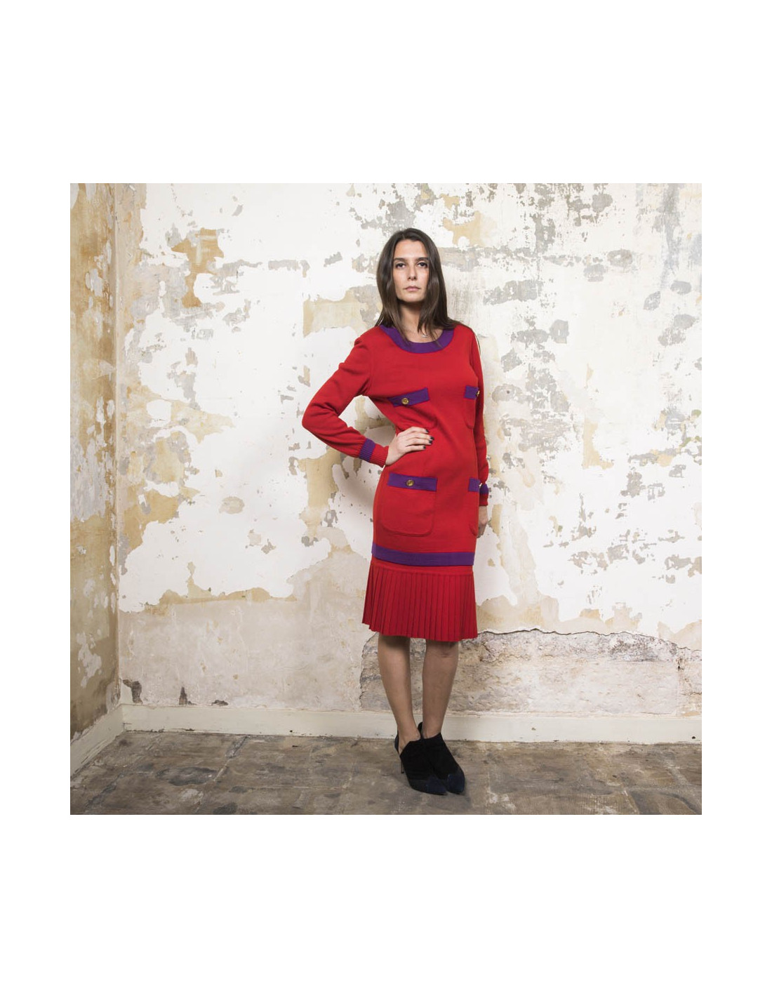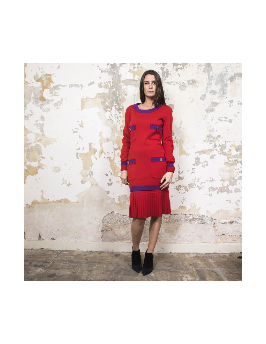 Chanel vintage sweater and skirt set in red wool with purple borders. Made in Italy. Vintage.