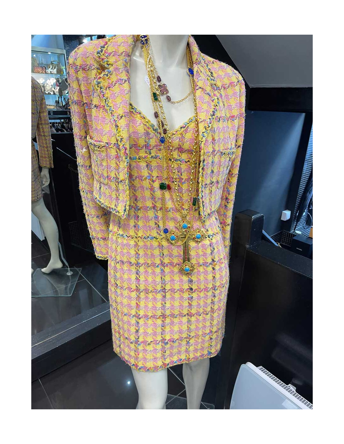Last items in stock SETS CHANEL vintage yellow jacket and skirt suit CHANEL 29227 3,900.00 € CHANEL vintage suit size 42FR Condition : goodMade in FranceSize : 42FRMaterials : wool, silkLining: yellow monogram silkColor : yellowMeasurements:Jacket: shoulders: 40 cm, underbust: 50 cm, height : 67 cm, sleeves length : 56 cm, wrist circumference: 25 cmSkirt : waist: 37 cm, length : 56 cmDetail : vintage Fall/Winter 1994, 4 patch pockets, Chanel logo... Add to cart