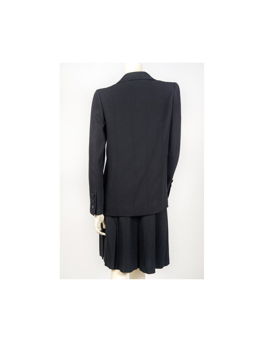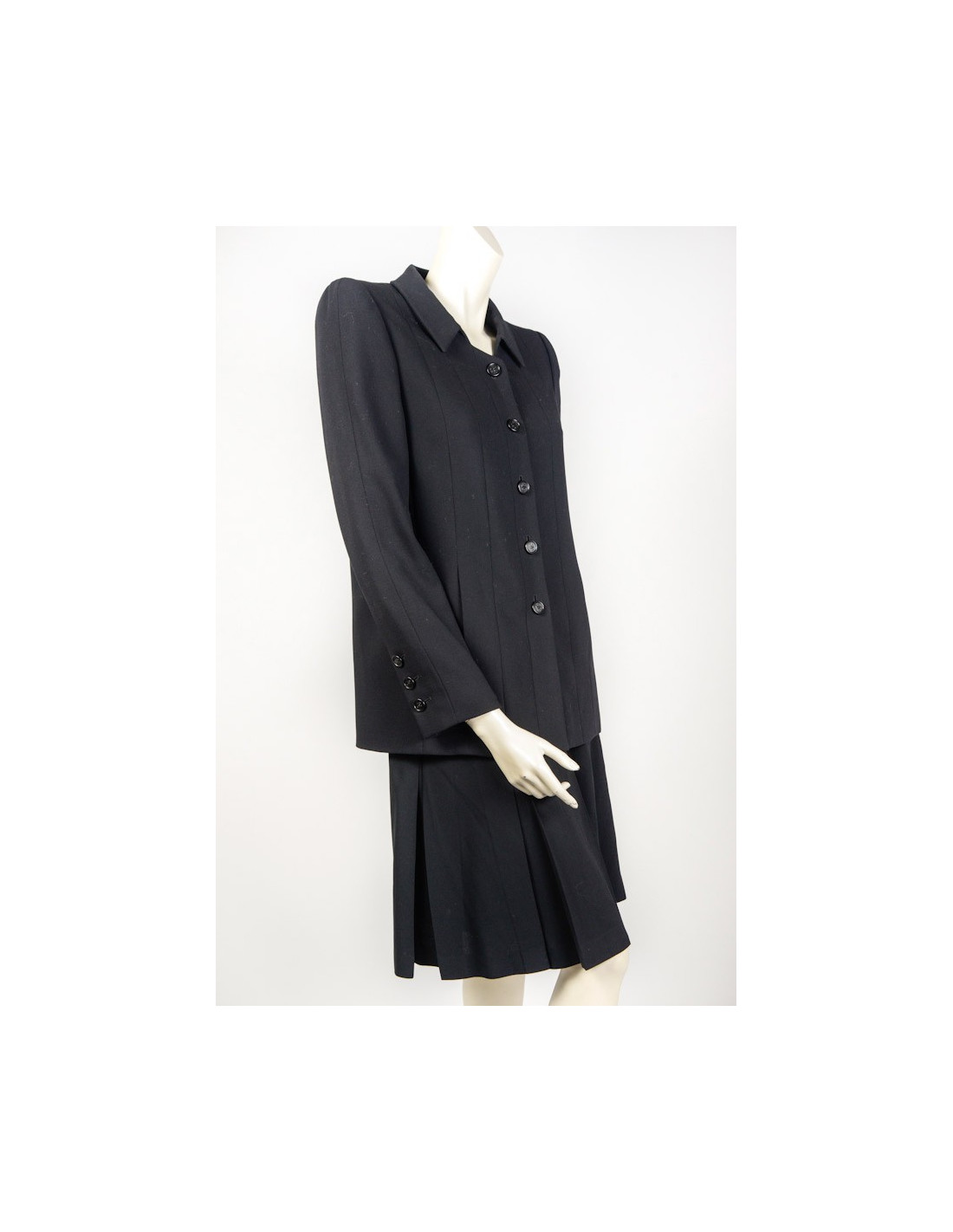 Tailor skirt Chanel Black wool. Size 38. Collection Spring 98. The jacket is wool with a silk lining. It has two pockets. Closing 5 buttons initials "CC". In very good condition. Height: 69 cm, chest width: 46 cm, width height: 47 cm, arm length: 62 cm, width shoulder: 38 cm The skirt is pleated cotton. Closure 3 buttons initials "CC" with a zip below. In very good condition. Height: 52 cm, width height: 35 cm, width hips: 45 cm