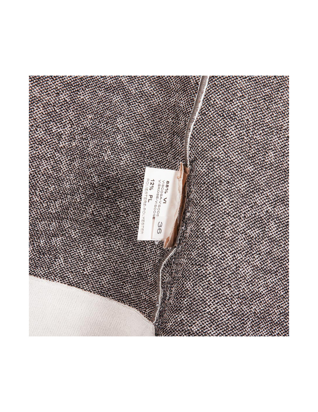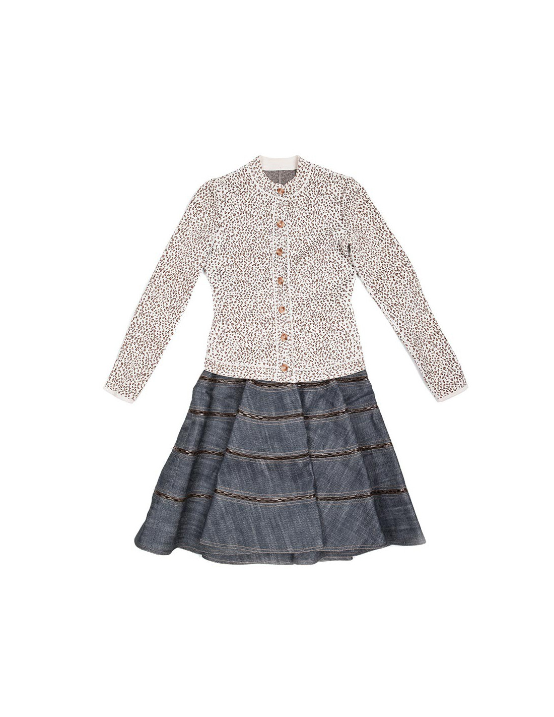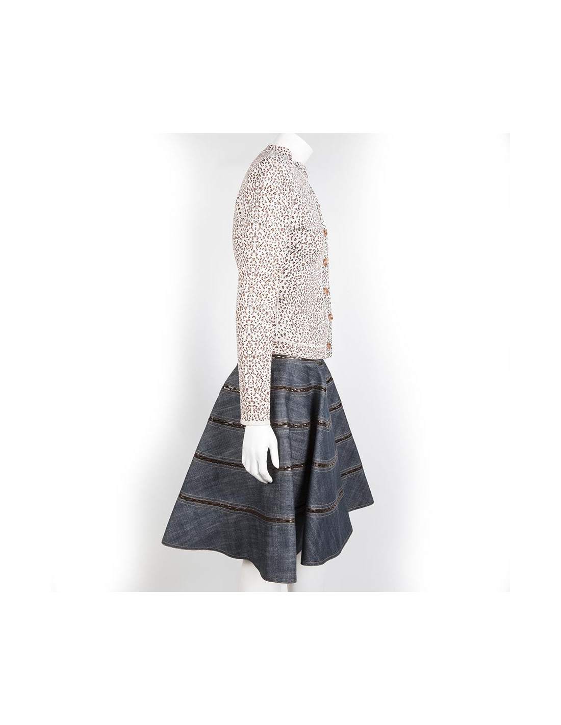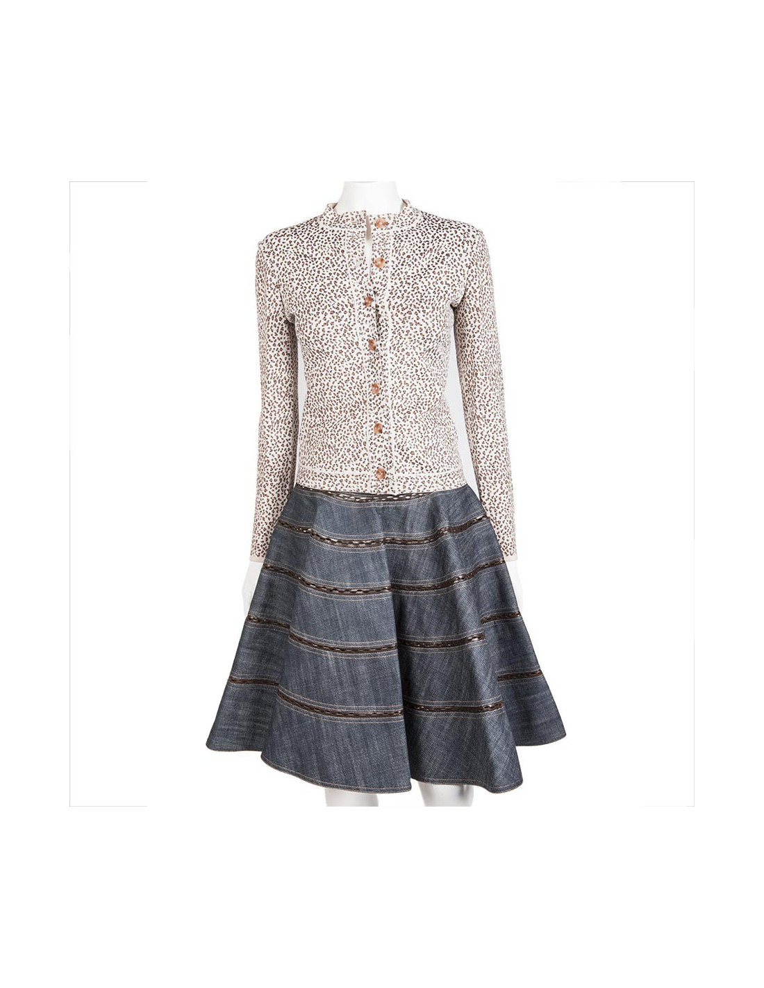 High waist denim skirt in jeans, striped with thin strips of genuine leather, zipper on the back. The vest is in viscose and polyester (see photo), beige leopard print, closes with a row of buttons.