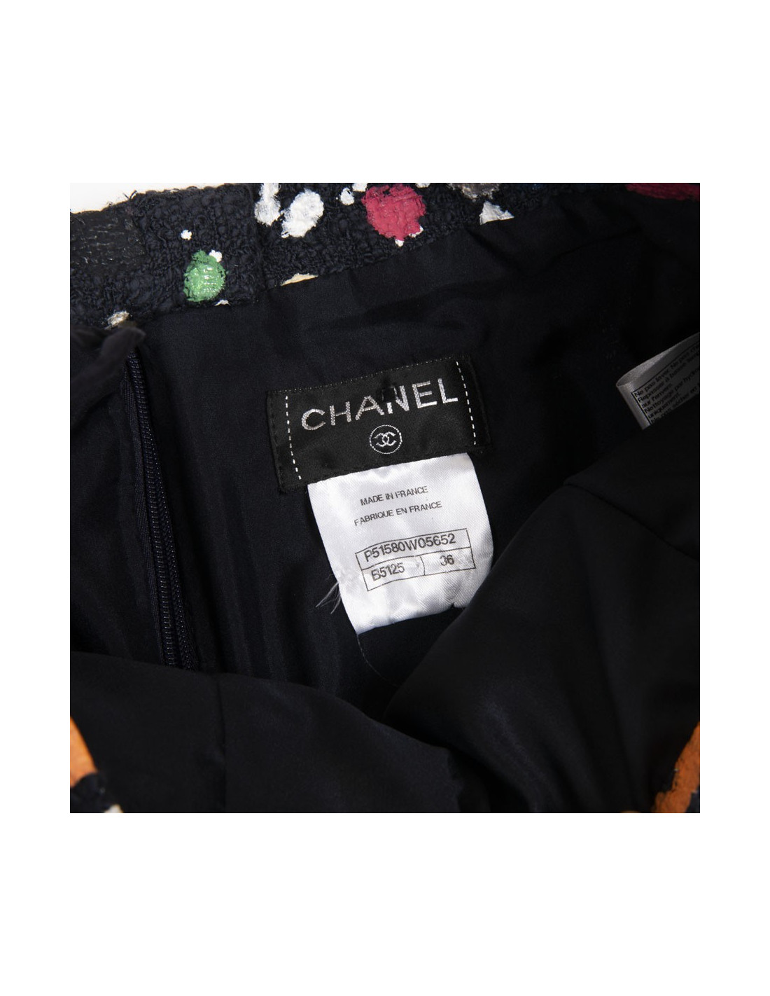 CHANEL pleated skirt in navy cotton tweed and multicolored paint size 36FR