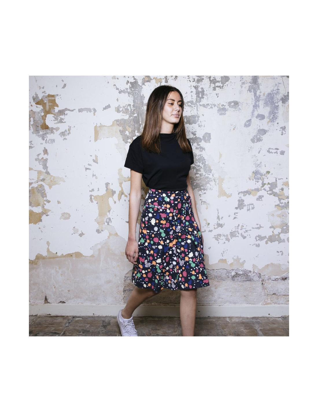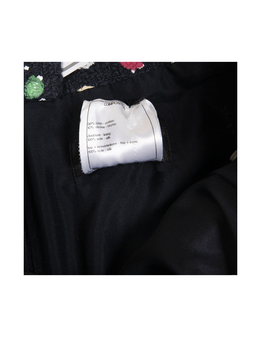 Chanel pleated skirt in navy cotton tweed and multicolored paint (pink, orange, green, silver, blue). Two large flat front pockets with pink enamel buttons and golden CC signature. Size 36FR.