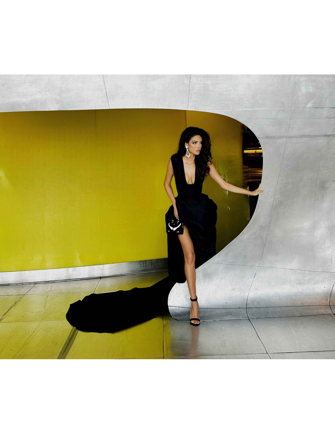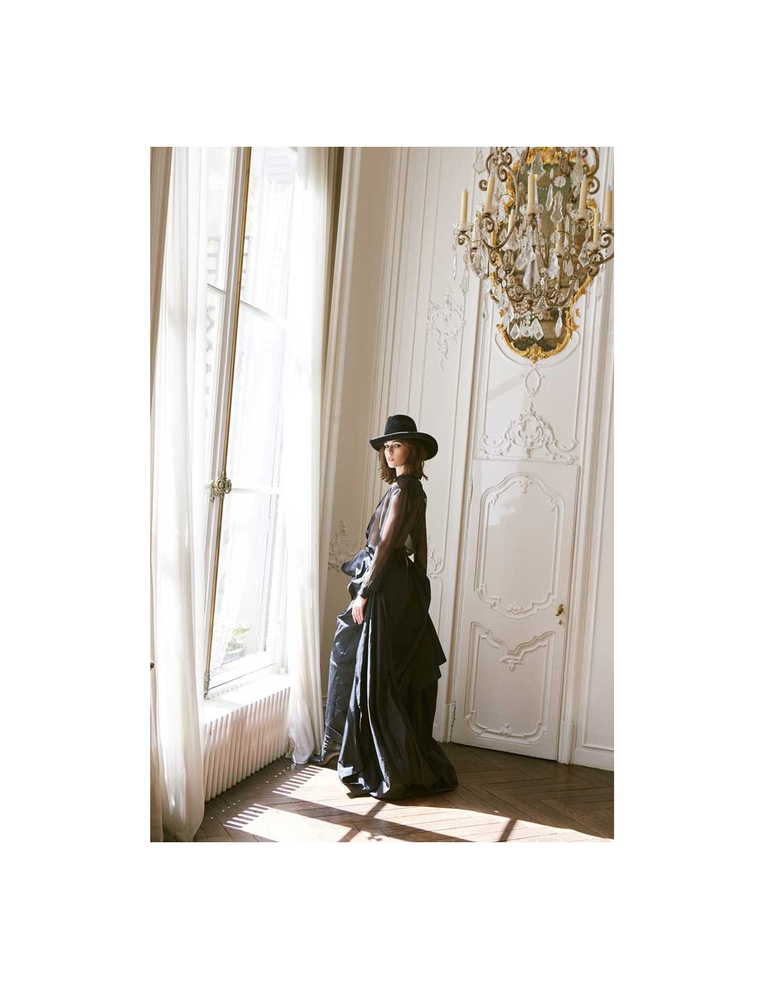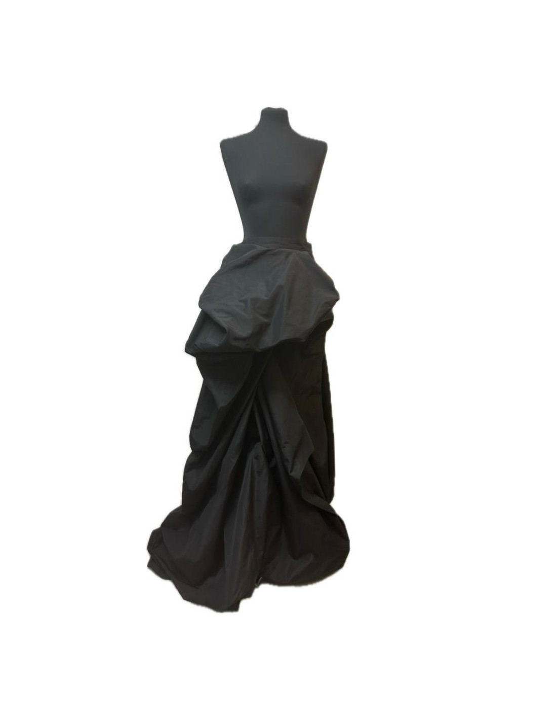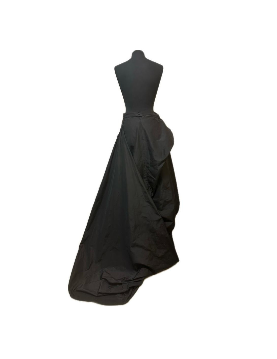 Details : Exceptional piece. Skirt in black taffeta, with a vthat can be attached to the waistband to make it shorter.ery long train . Inspired by victorian bustle skirts.