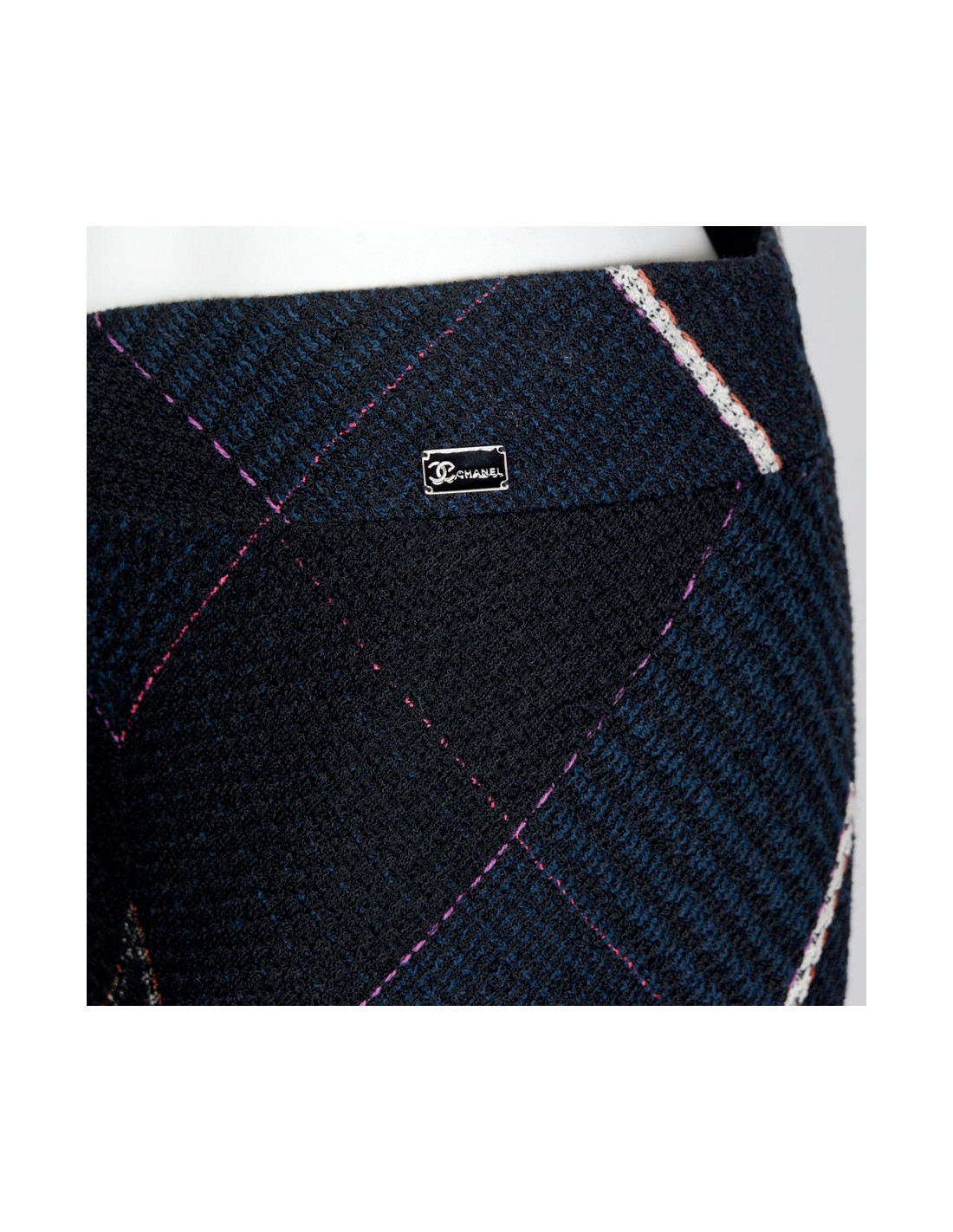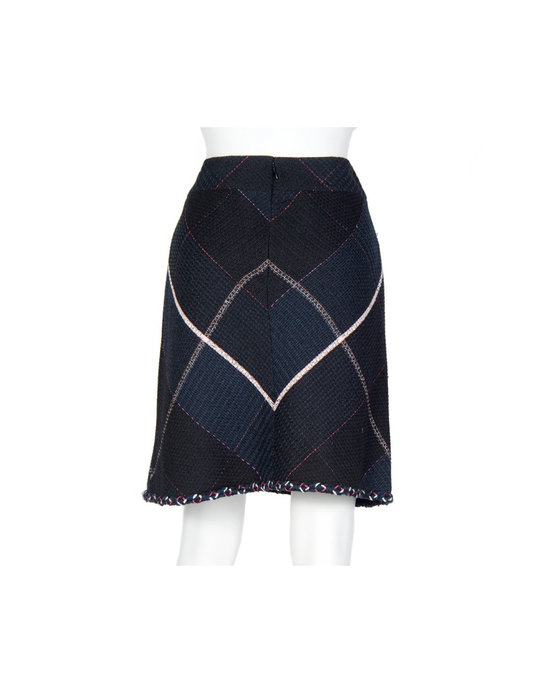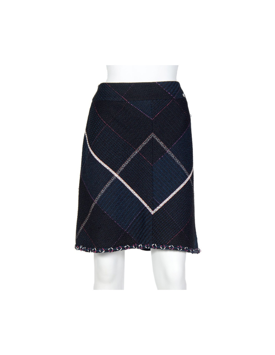 Navy blue cotton tweed Chanel skirt and black with geometric patterns. Size 42. Zipper in the back. Tweed twisted at the bottom of the skirt hem. The lining is black silk. In very good condition.