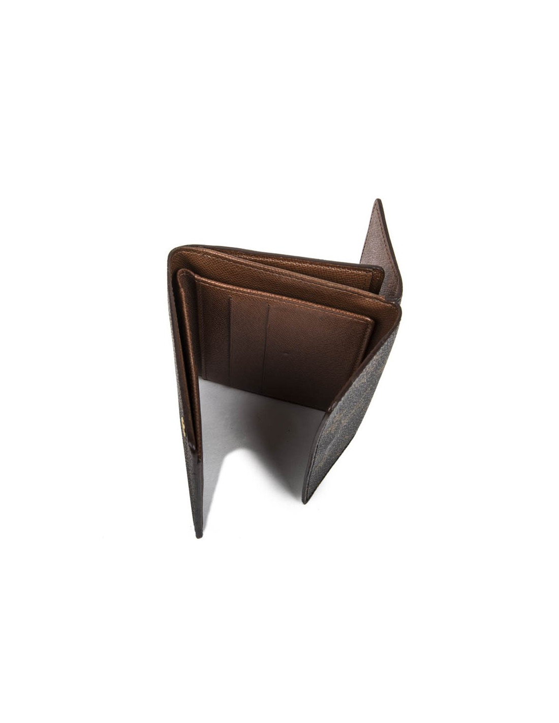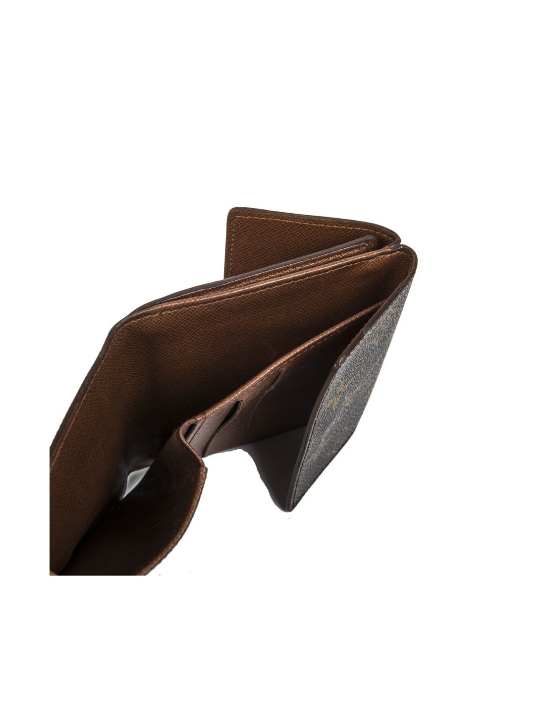 Louis Vuitton wallet in brown monogram coated canvas. There is one side for cards and bills and one side for coins. Each side closes with a snap, an apparent engraved Louis Vuitton and one invisible.