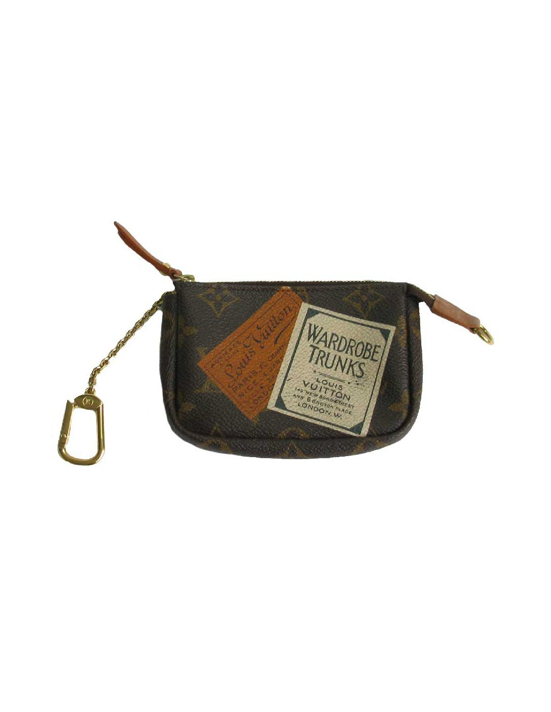 Mini pouch - keychain Louis Vuitton 'Wardrobe Trunk' in brown monogram canvas. There are prints of classic trunks and advertising stickers.