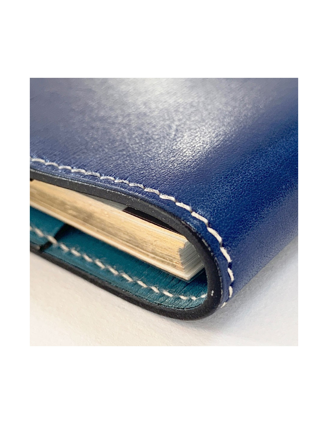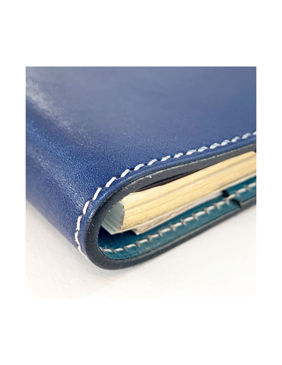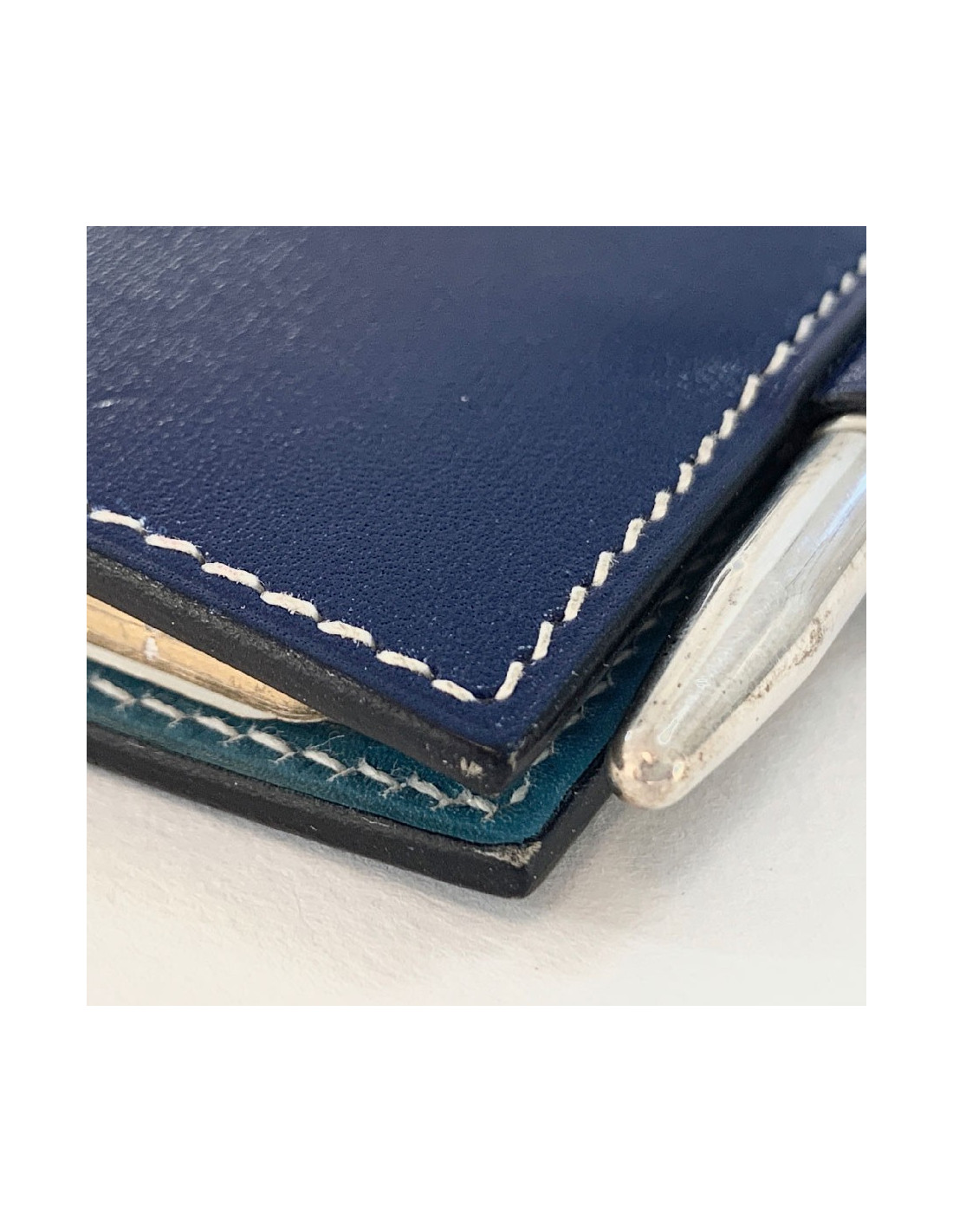 Slip it into your bag! HERMES small agenda cover in dark blue leather on the outside and light blue on the inside. It features 2 gussets for slipping in various papers and 2 pins for hanging refills.