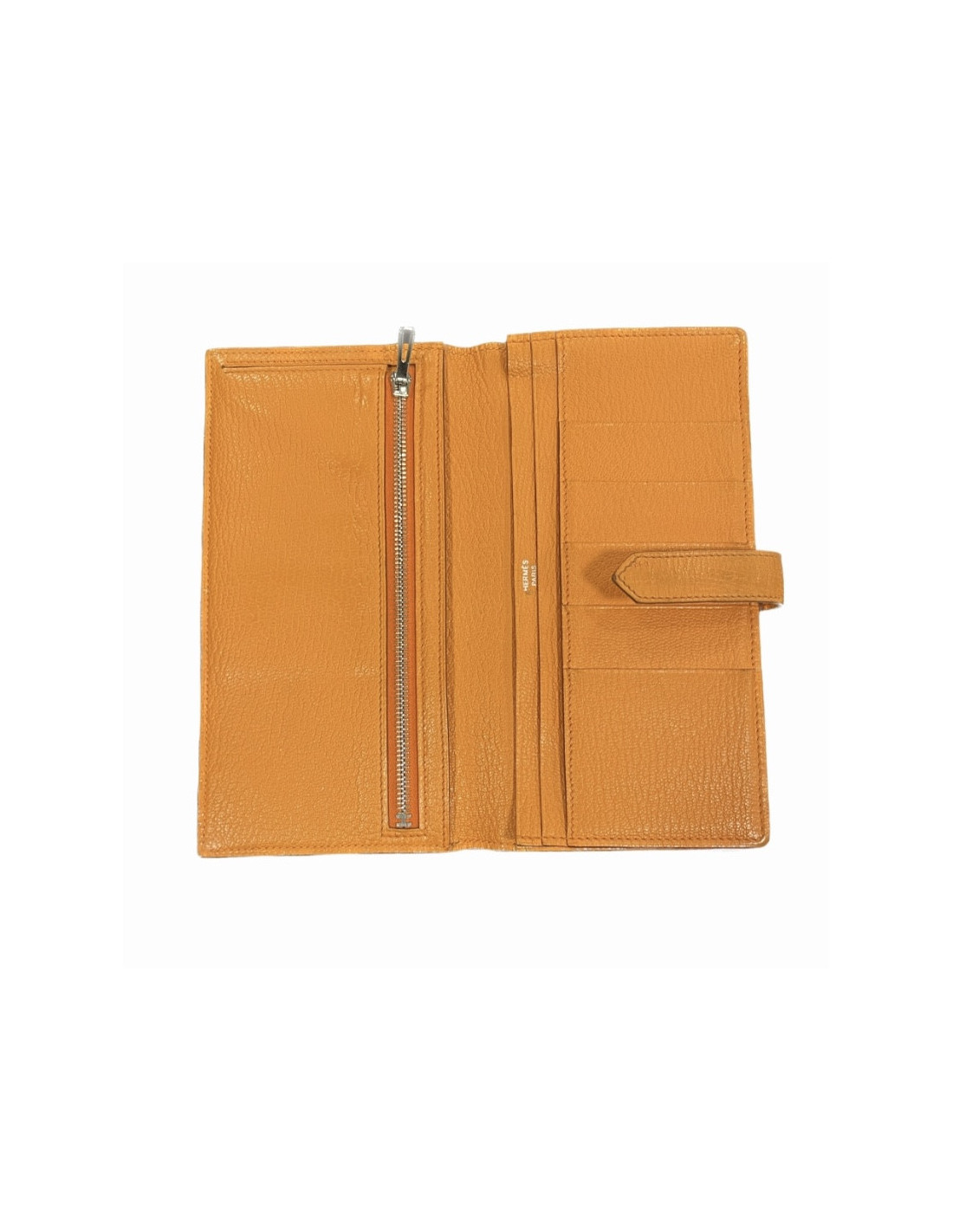 Details : emblematic H clasp, S of sales stamp next to the Hermès signature on the inside of the wallet. Inside, there's a zippered coin purse, two flat pockets and five slots for credit cards.