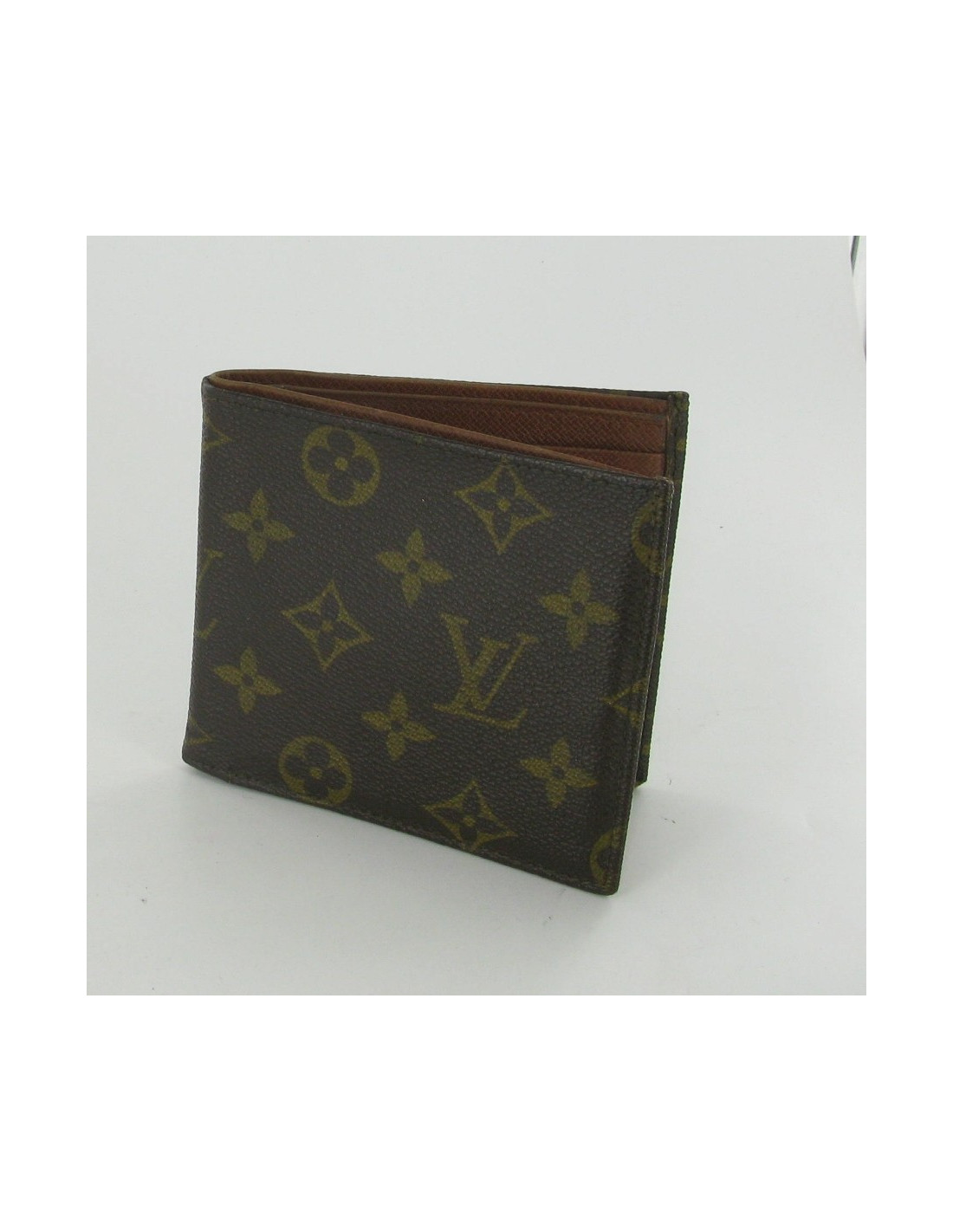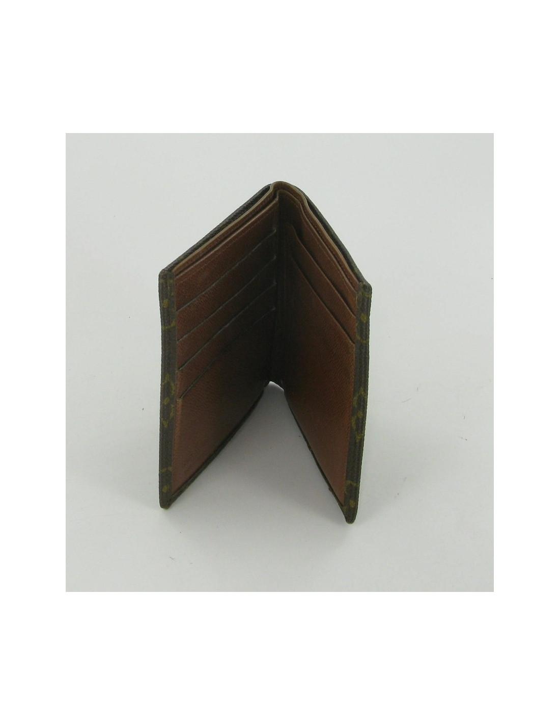 LOUIS VUITTON monogrammee LOUIS VUITTON coated canvas vintage wallet. The Interior is brown leather. There are: 3 slots for cards, 2 bellows for banknotes, 2 pockets and 2 bellows for cards. Outside, lES corners are slightly damaged. Inside, the leather has wear. Delivered with his LOUIS VUITTON bag.