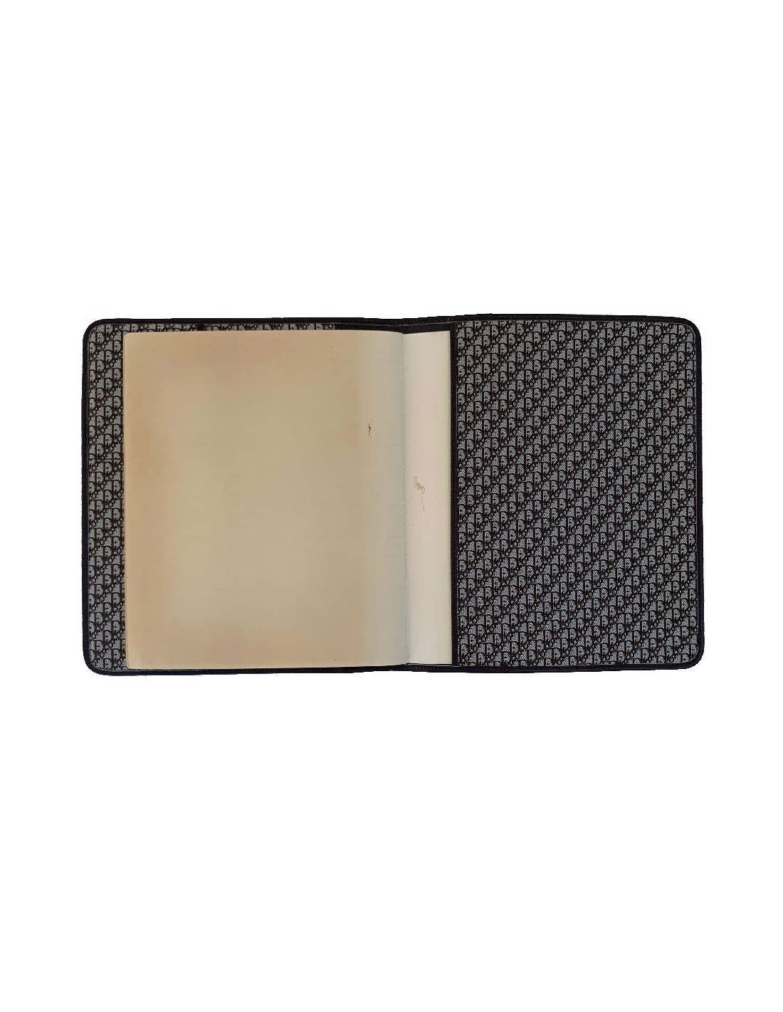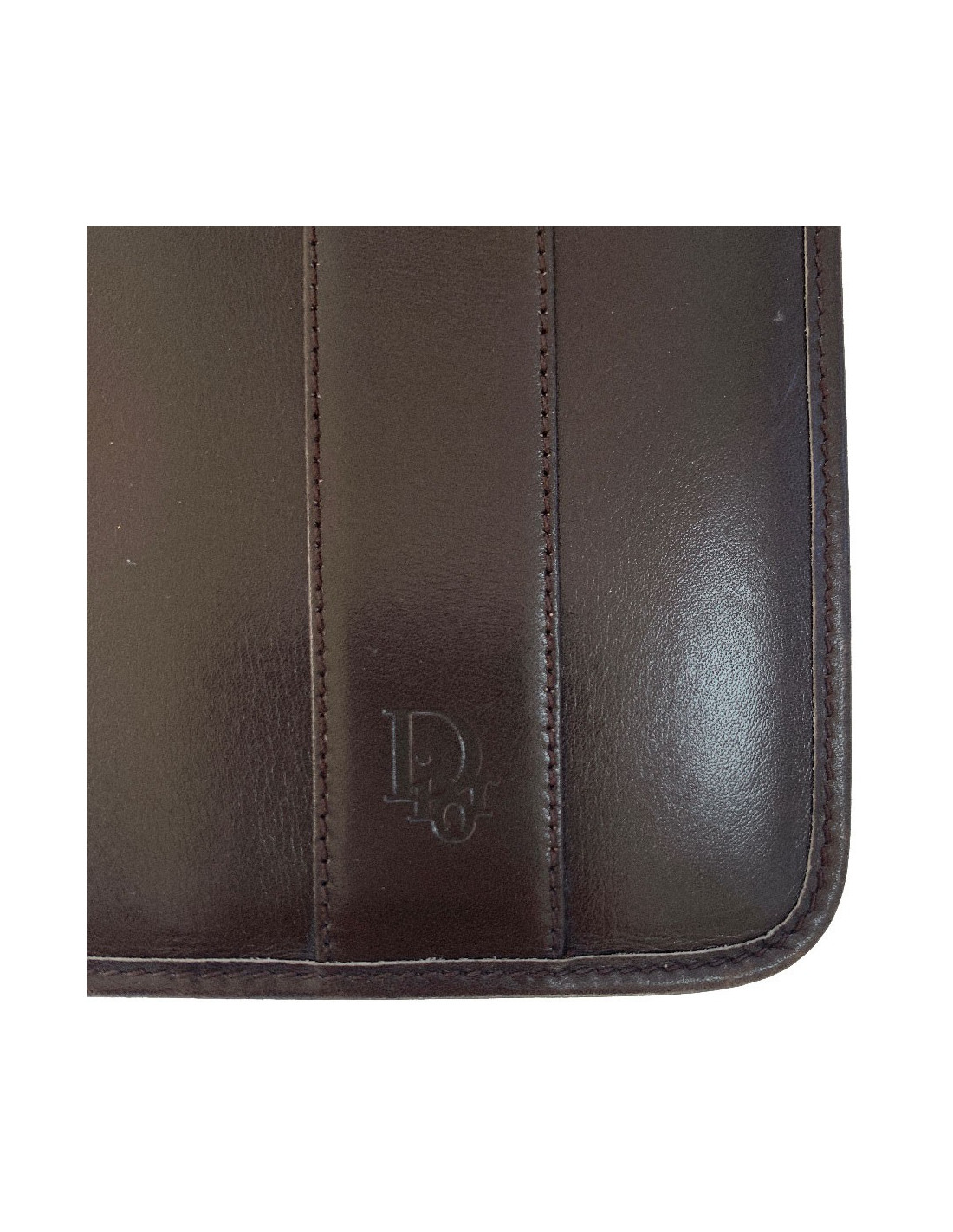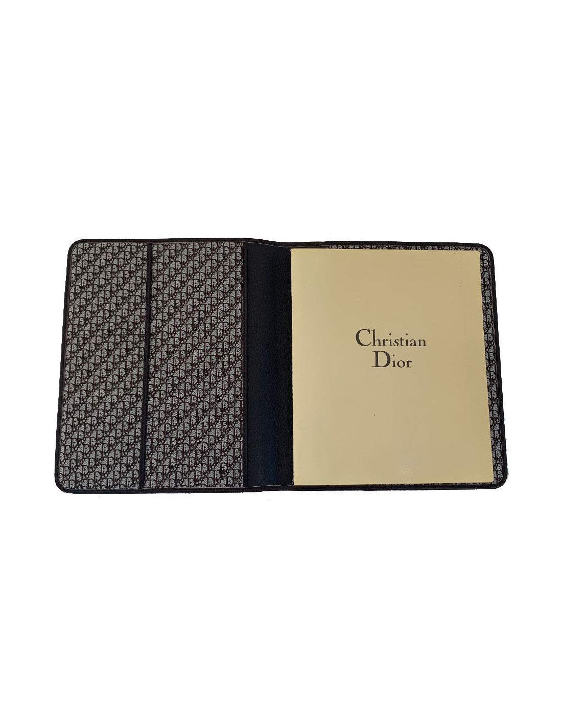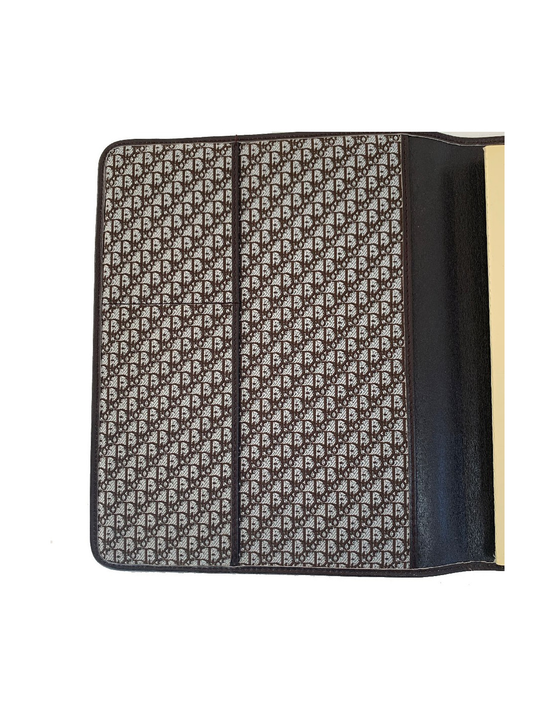 We love it! CHRISTIAN brown leather agenda cover. Vintage piece. Brown leather interior and brown monogram canvas. The interior features 2 card slots and 2 gussets for a diary. It contains the original, unused telephone directory.