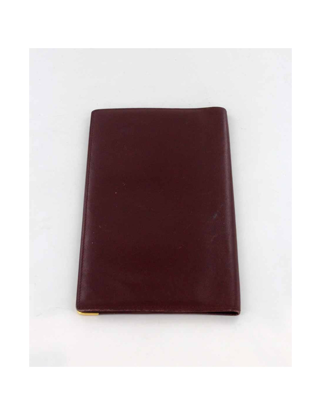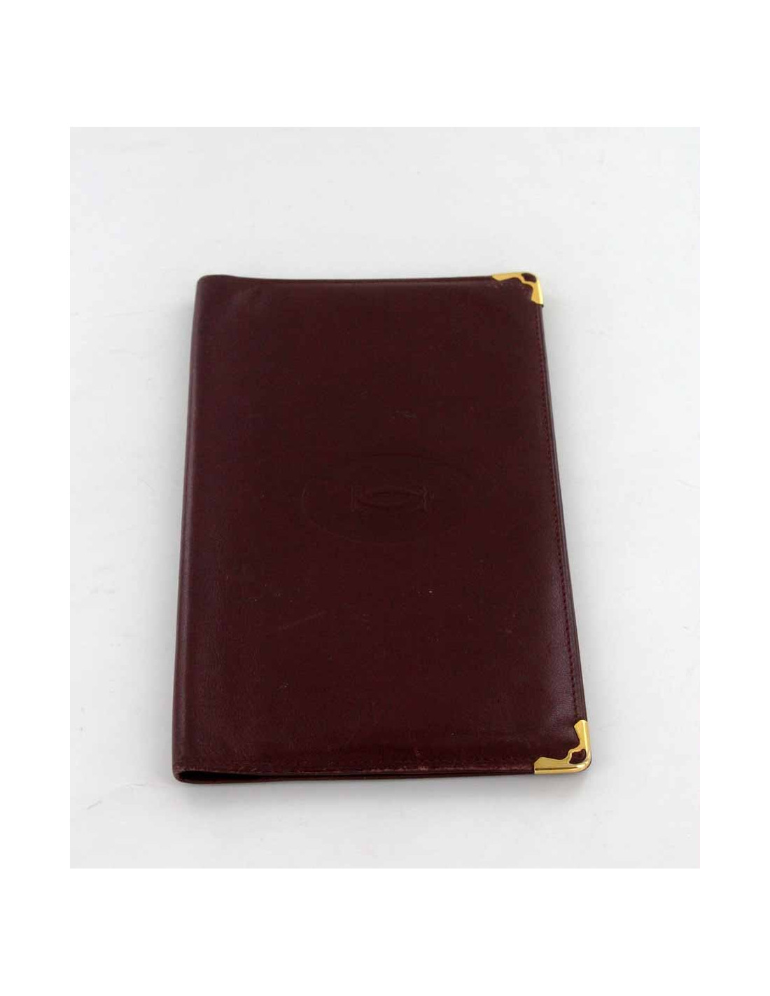 Portfolio of the timeless collection MUST de CARTIER Burgundy calfskin leather. This portfolio is adorned with Golden corners Burgundy smooth leather, there are some micro scratches from use. THEfootprint of the House, the legendary Double C Monogram embossed, figure on top. Good condition. Dimensions: 18.3 x 10.8 cm PP: 235 EUR