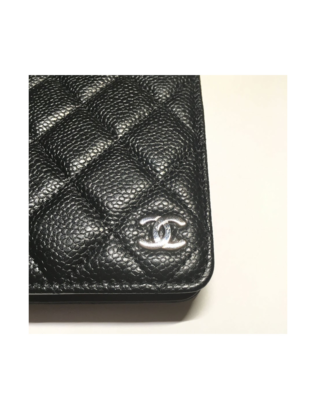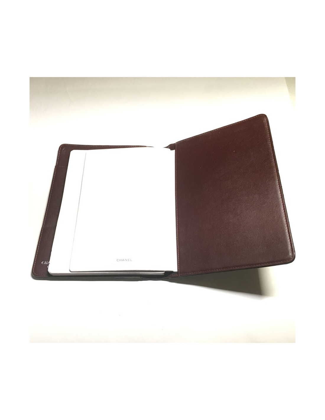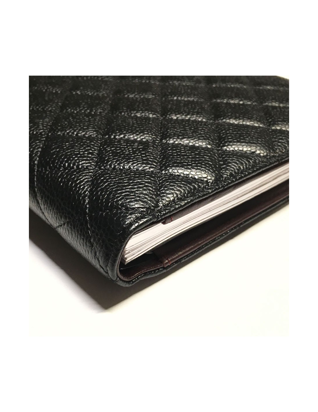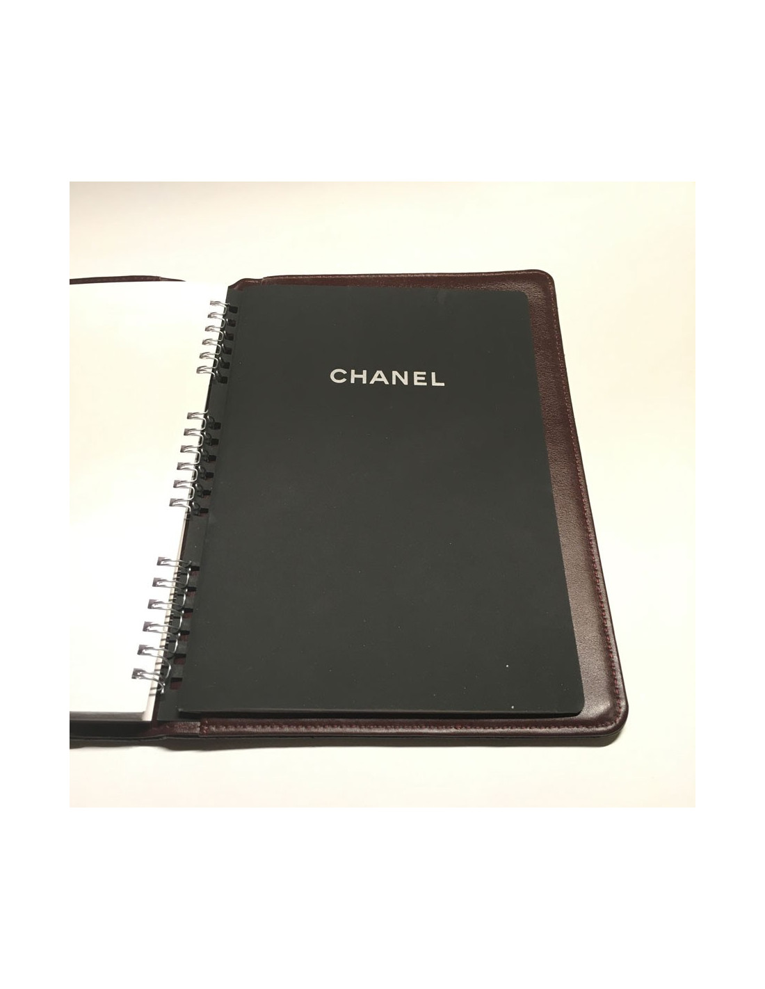 Door agenda CHANEL black quilted leather. Small CC silver on the cover. Inside Burgundy leather and spirals. 2 large slots for documents, a smaller card. Address book black at the end of the door agenda.