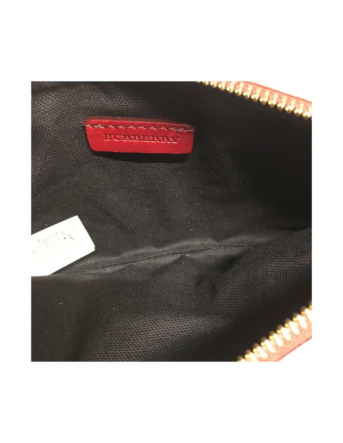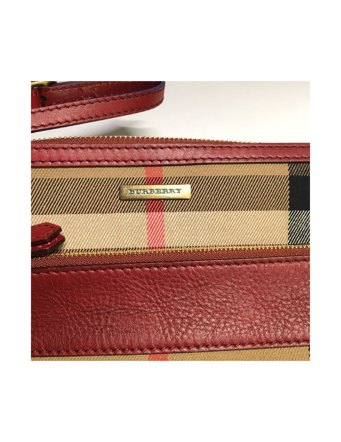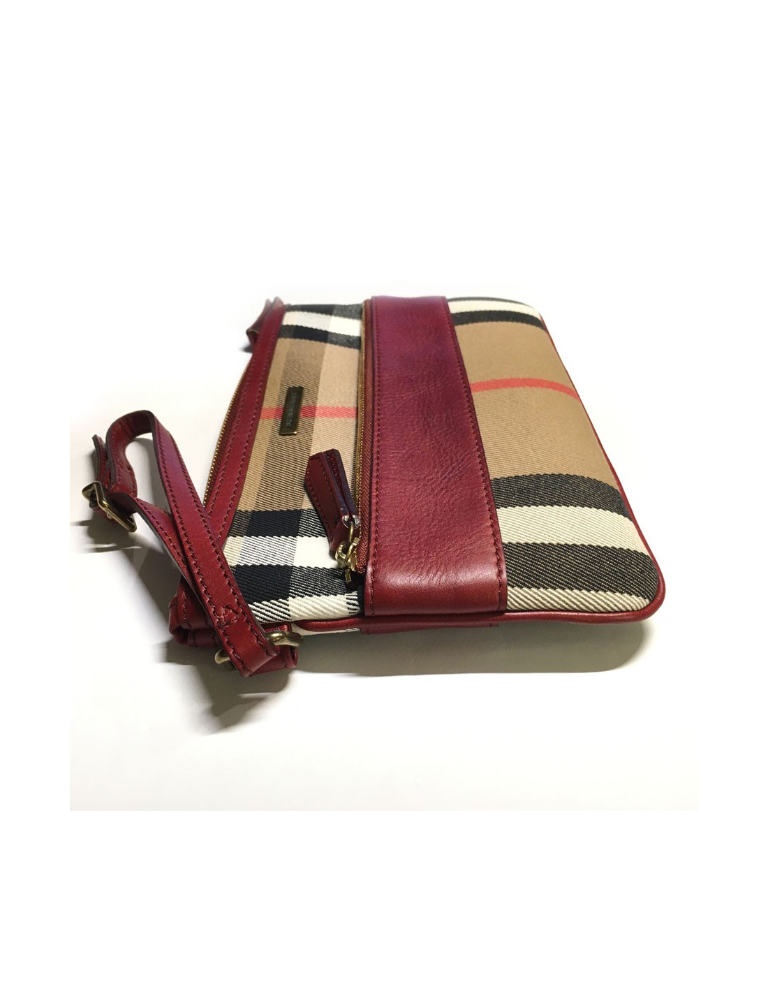 BURBERRY Haymarket Check canvas and Burgundy leather pouch. Opens zip, a leather handle allows you to wear this clutch. Interior black fabric.