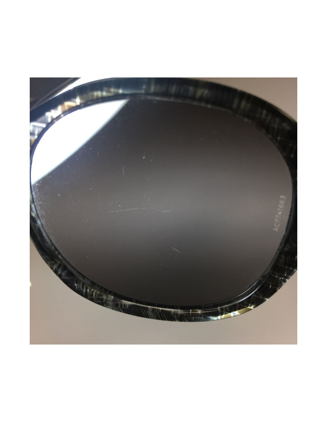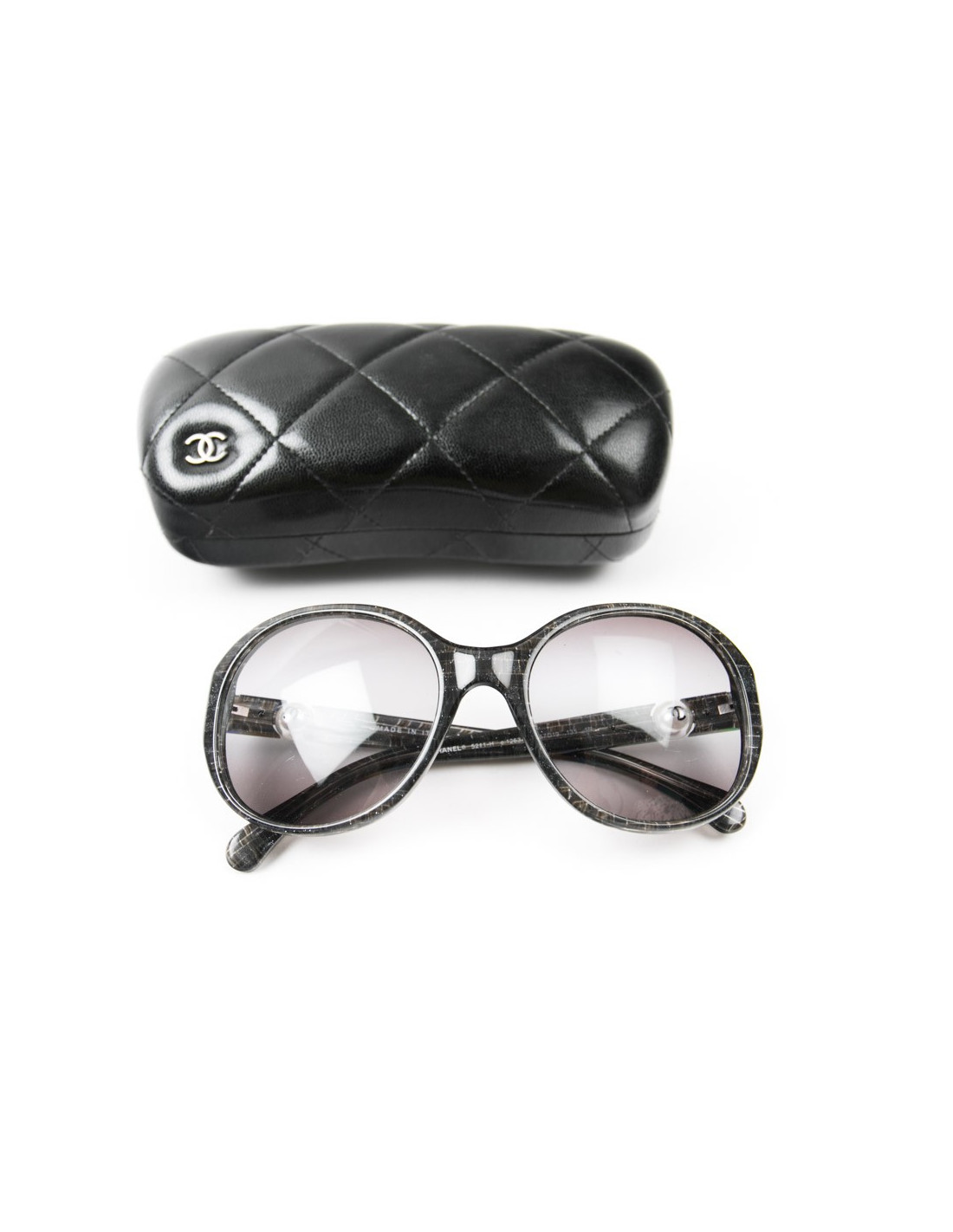 Sold SUNGLASSES CHANEL sunglasses grey and black plastic CHANEL 19149 200.00 € CHANEL sunglasses. Gray and black plastic frame. Inclusion of elements Golden representative symbols of the mark in the branches: CC, 5,... Lens color: black gradient. Pair in correct state. The right glass is scratched on a part (see photo). 1 stripe on the left glass (see picture). Dimensions: width between the branches: 9 cm - length of branches: 13 cm... View