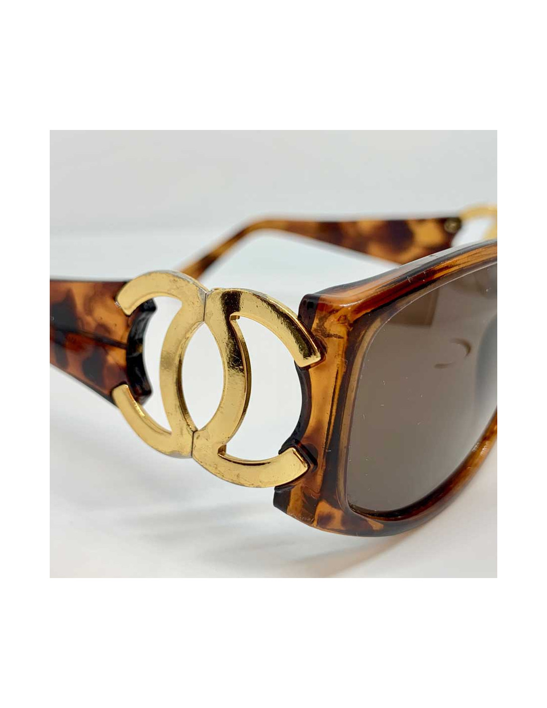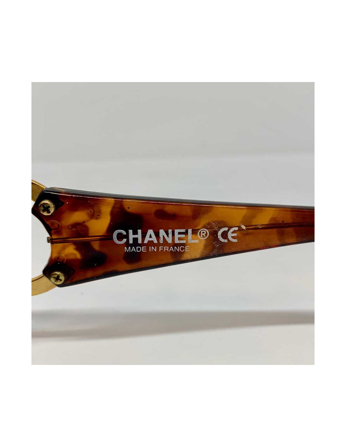 Sold SUNGLASSES CHANEL sunglasses grey and black plastic CHANEL 19149 200.00 € CHANEL sunglasses. Gray and black plastic frame. Inclusion of elements Golden representative symbols of the mark in the branches: CC, 5,... Lens color: black gradient. Pair in correct state. The right glass is scratched on a part (see photo). 1 stripe on the left glass (see picture). Dimensions: width between the branches: 9 cm - length of branches: 13 cm... View
