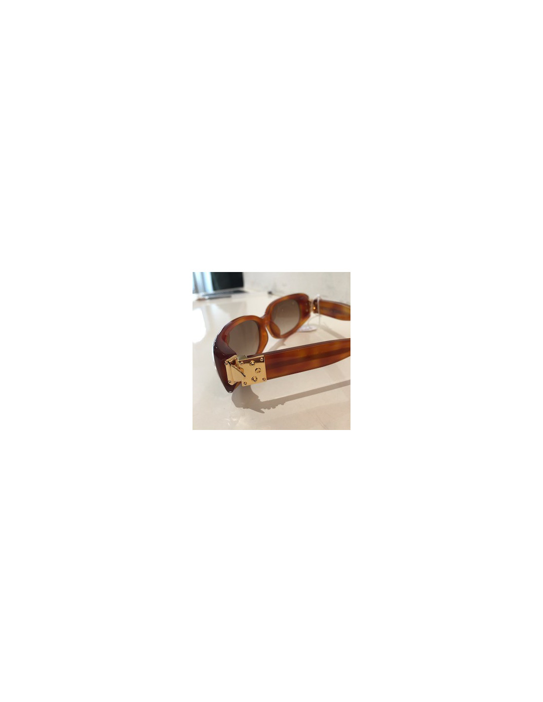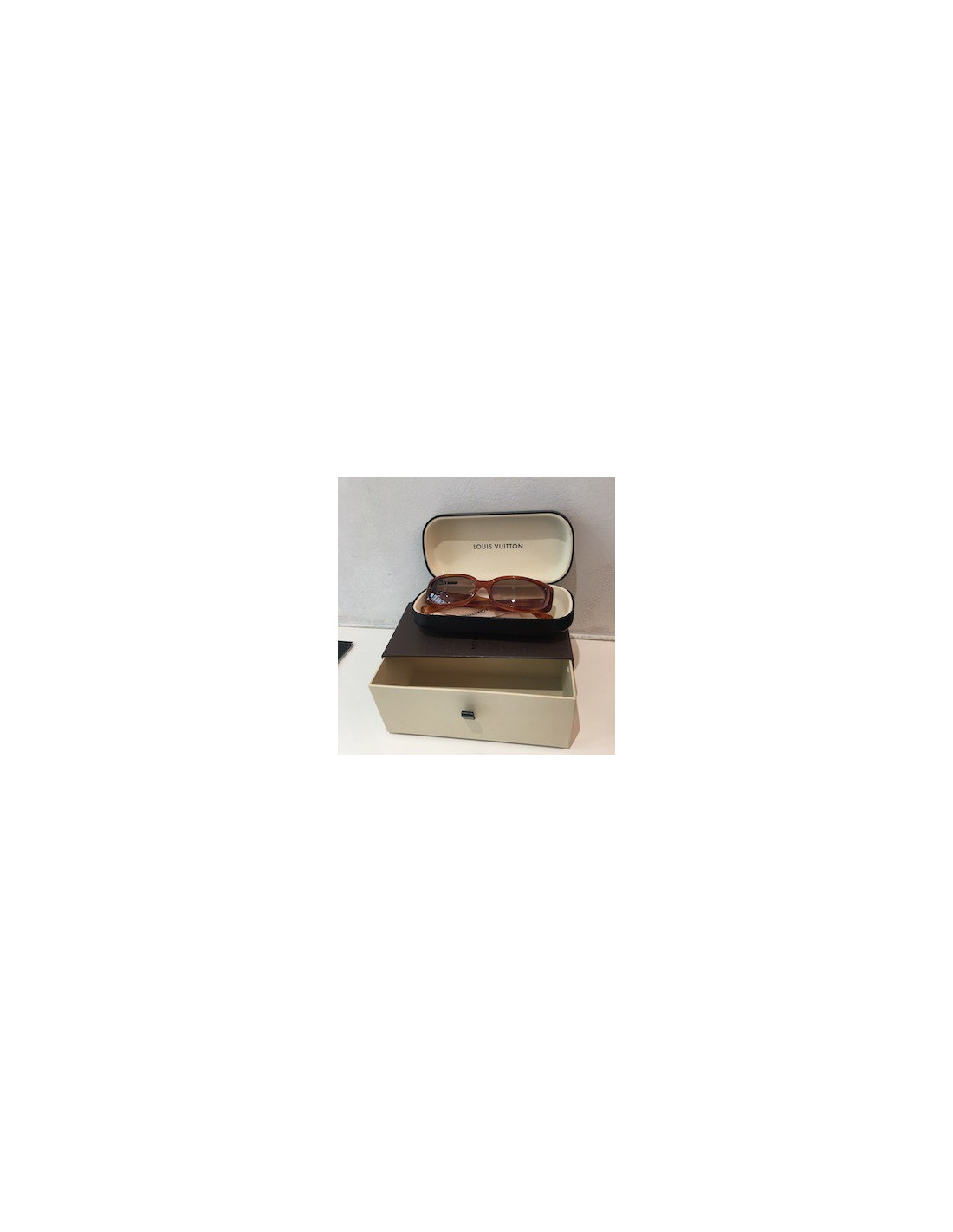 Lovely sunglasses from the Louis Vuitton brand in light brown plastic, in excellent condition. They have an elongated shape, their lenses are smoked, engraved with the LV logo, no stripes. the branches are topped with gilded metal which perfectly completes these pretty sunglasses. They are made in France by hand, we can read this mention inside the branches: HAND MADE IN FRANCE LOUIS VUITTON.