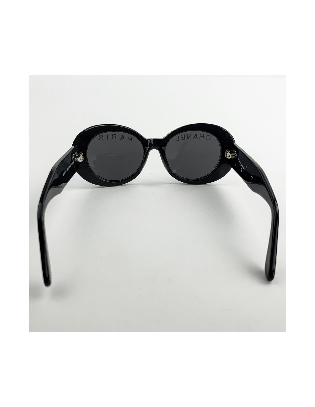 The sunglasses are from CHANEL. They are oval-shaped, black in color, with CHANEL on one lens and PARIS on the other. Each arm features the brand's double C in gilded metal.