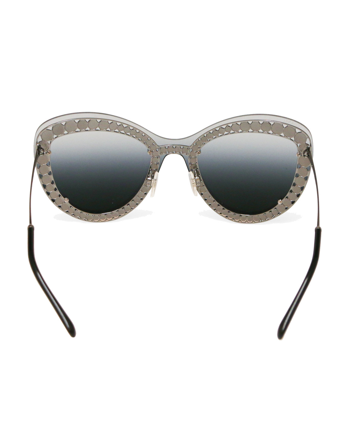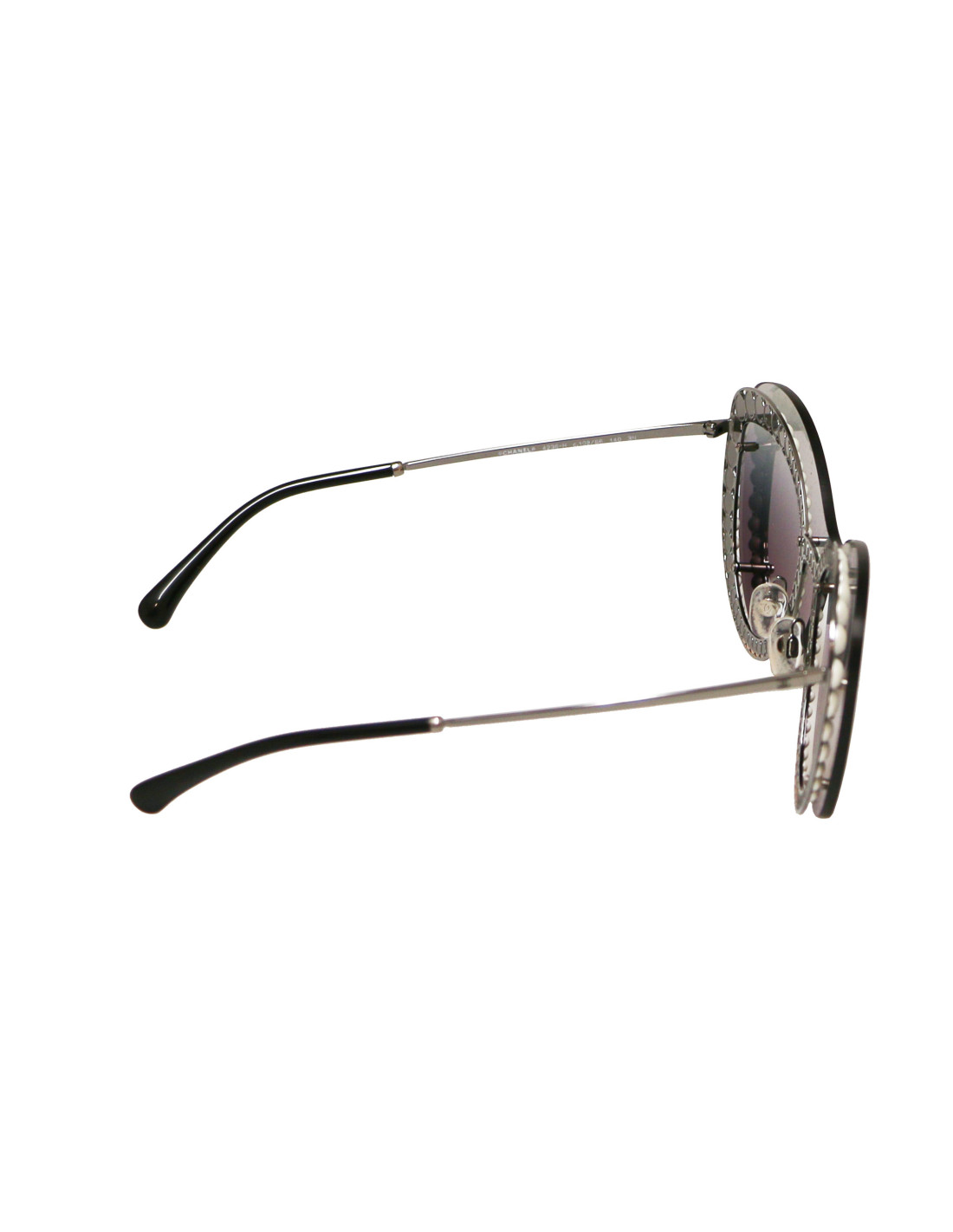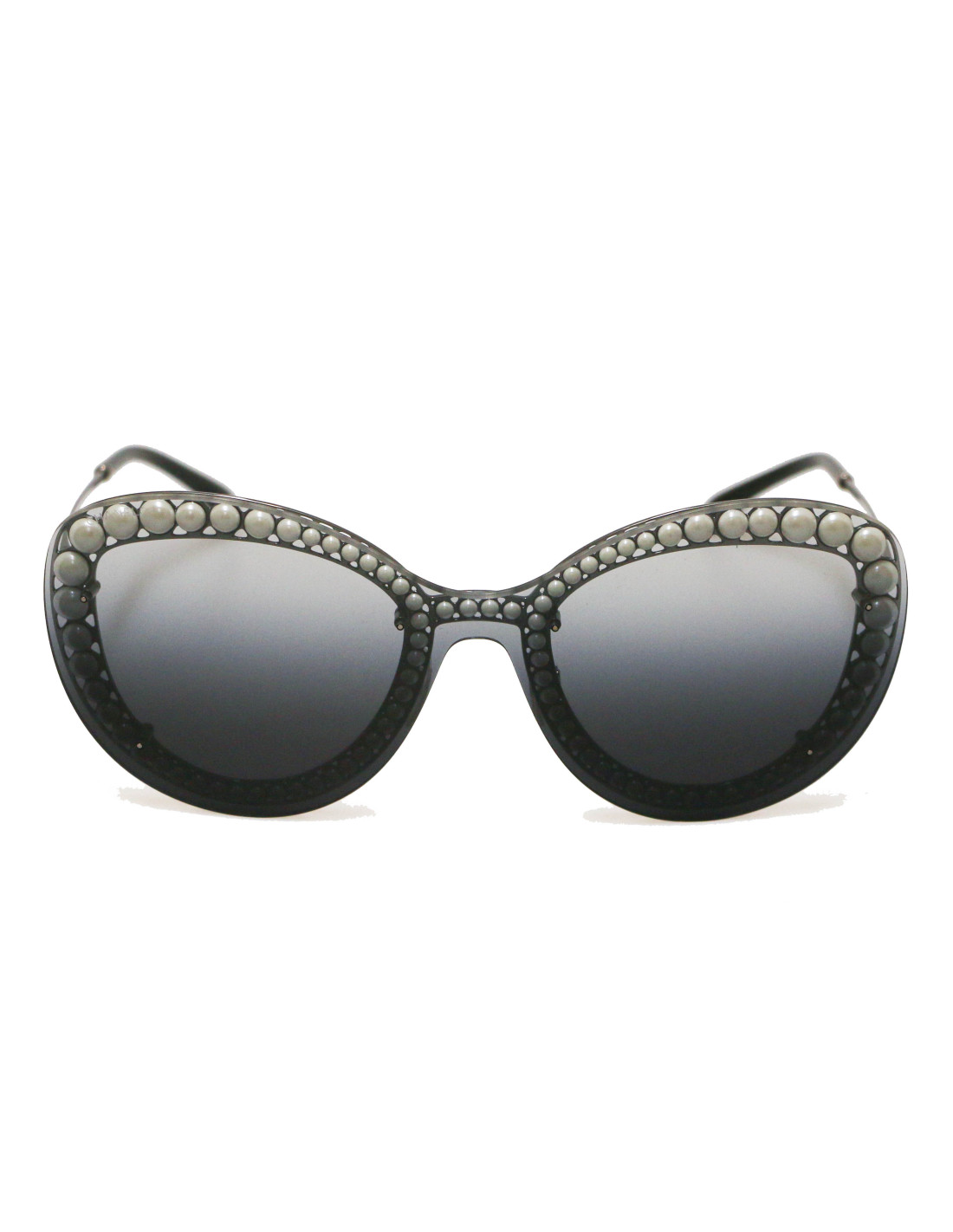 Details : Il y a sur les lunettes une plaque sertie de perles nacrées à l'arrière. Les perles sont visibles à travers les lunettes. Elles seront livrées avec leur chamoisine signée Chanel
