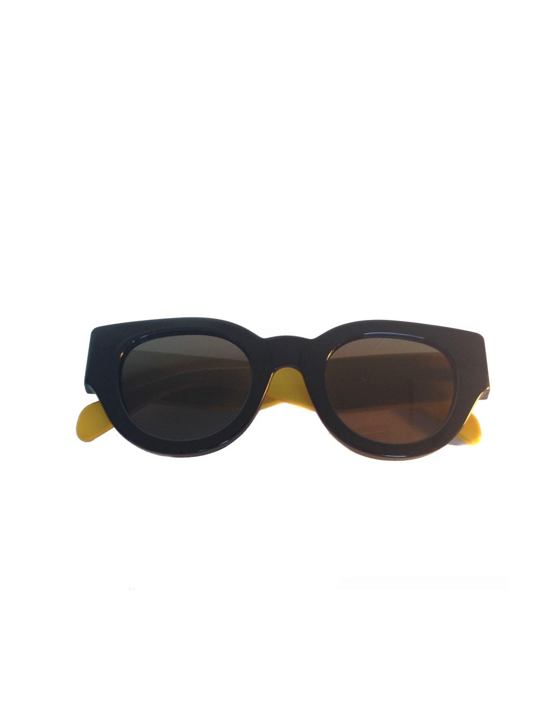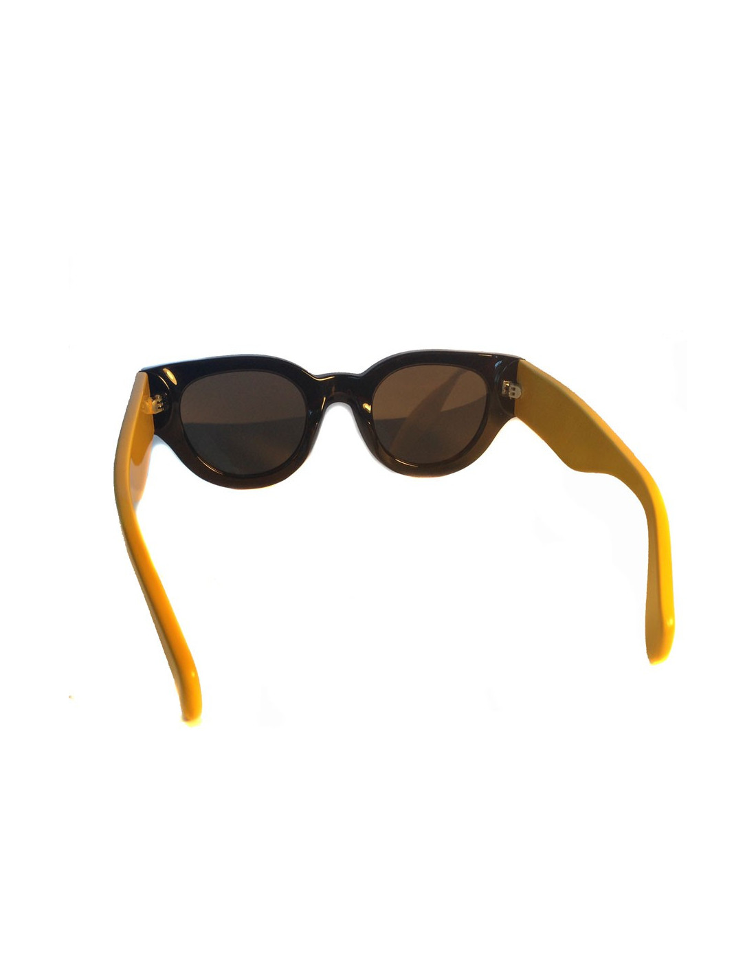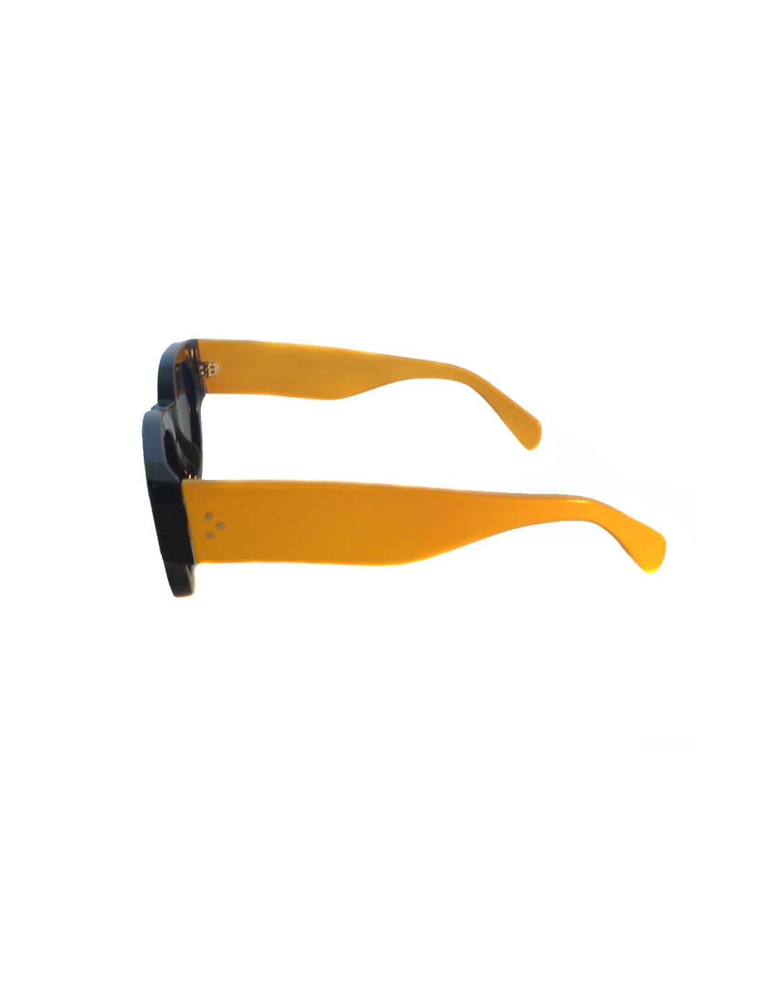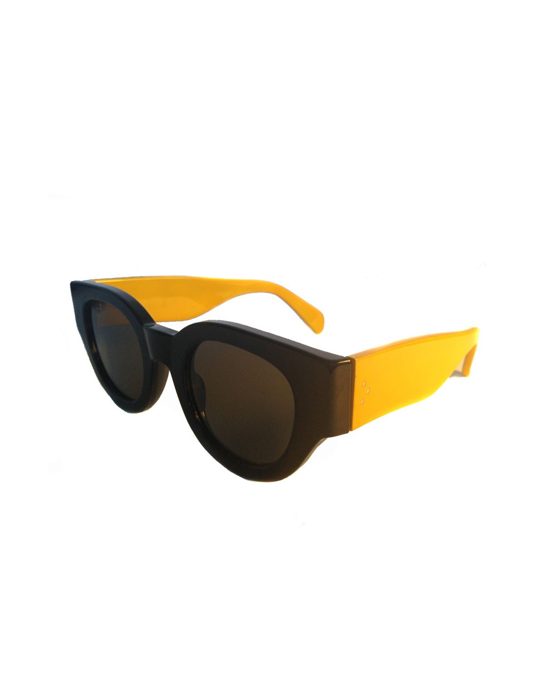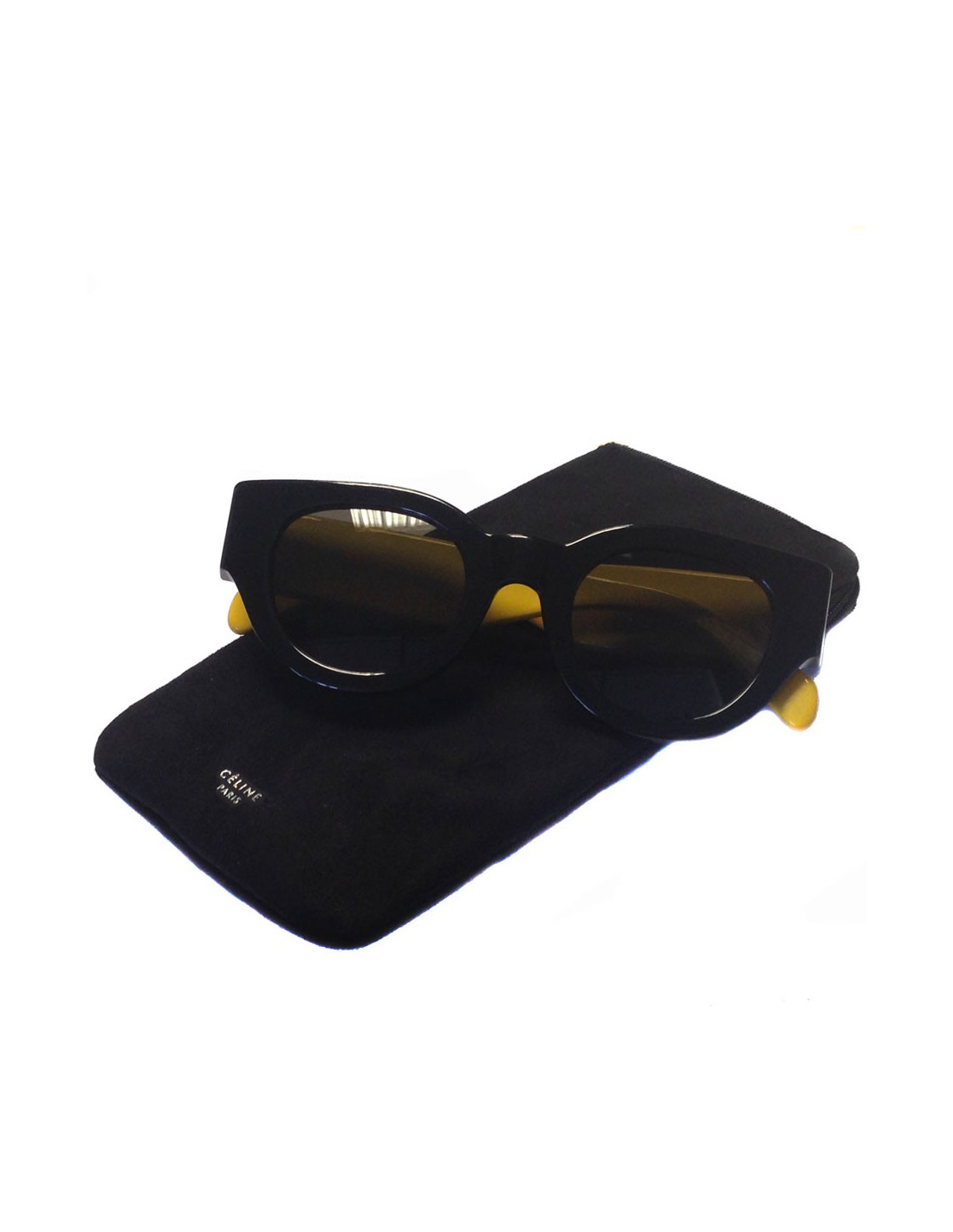 Pair of sunglasses Celine black and yellow branches, the type of the mount is circled, the color of the lenses is a dark brown. A few scratches on the mount microphones. Missing the acronym CELINE. It's a prototype. In good condition.