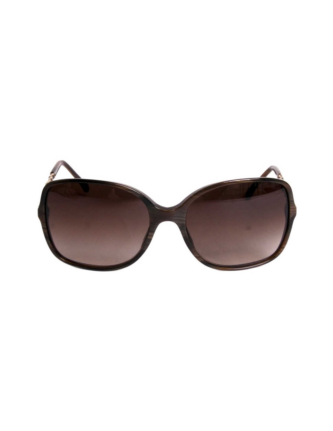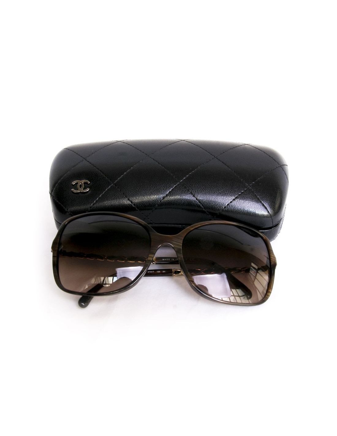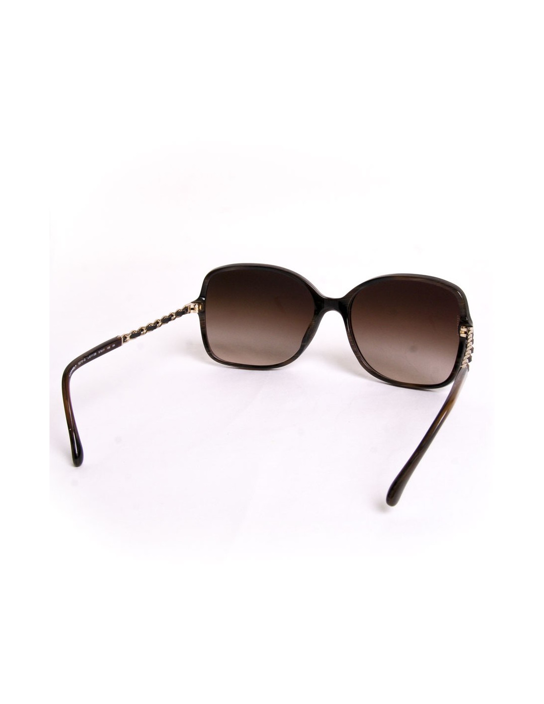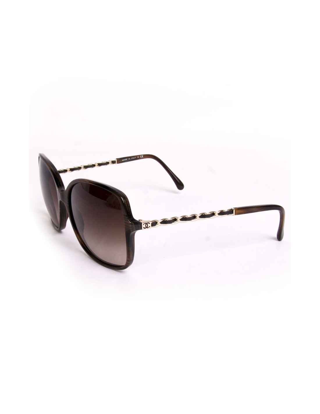 Gorgeous pair of sunglasses Chanel, the mount is brown imitation wood, branches are intertwined to a thin strip of glossy brown leather golden metal chain. Best public price: 230 euros.