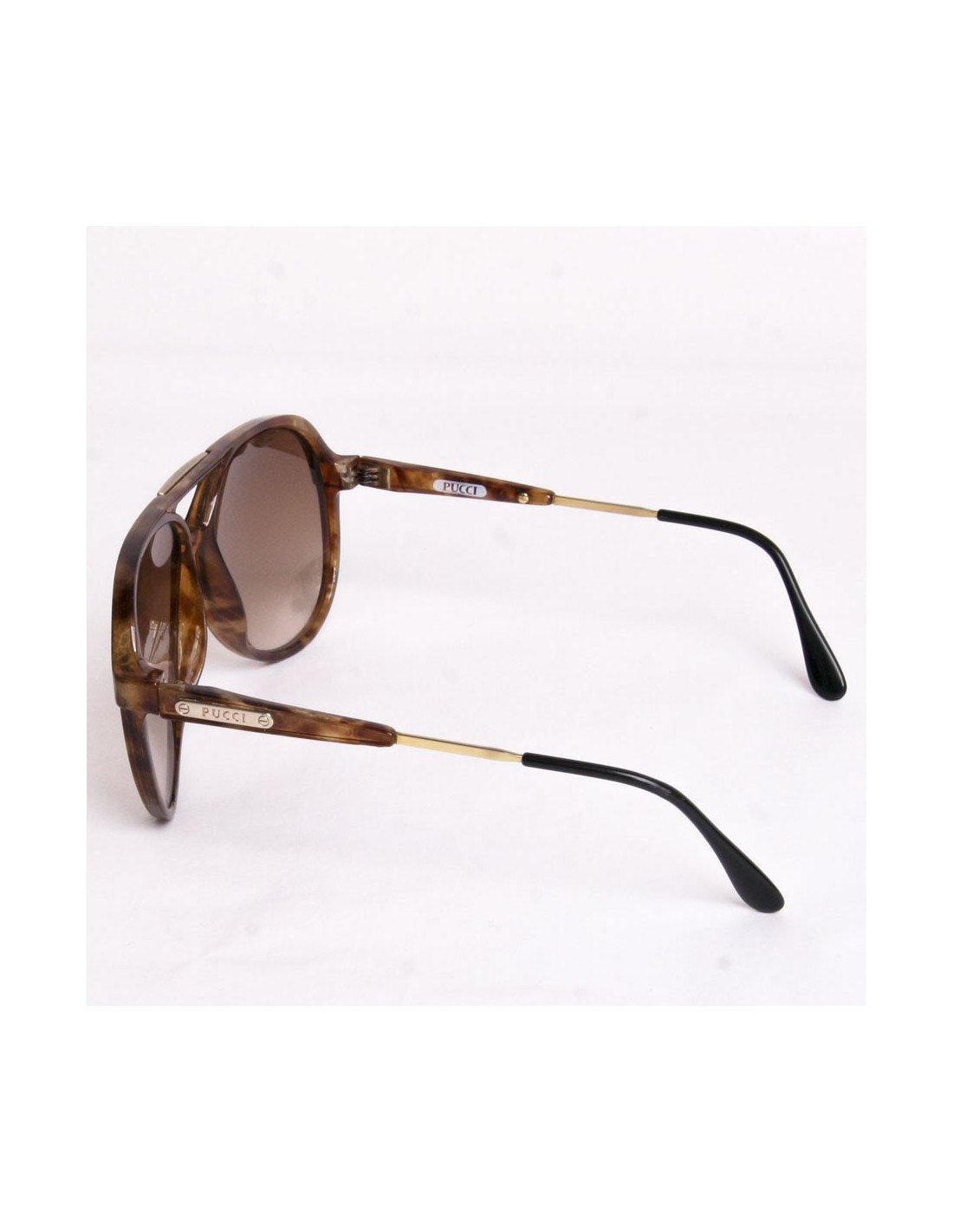 Pair of Pucci shape Aviator sunglasses, Brown way scale, branches are partly made of metal however brilliant, the mount type is circled, glass color is Brown, the Pucci brand is on the left branch.